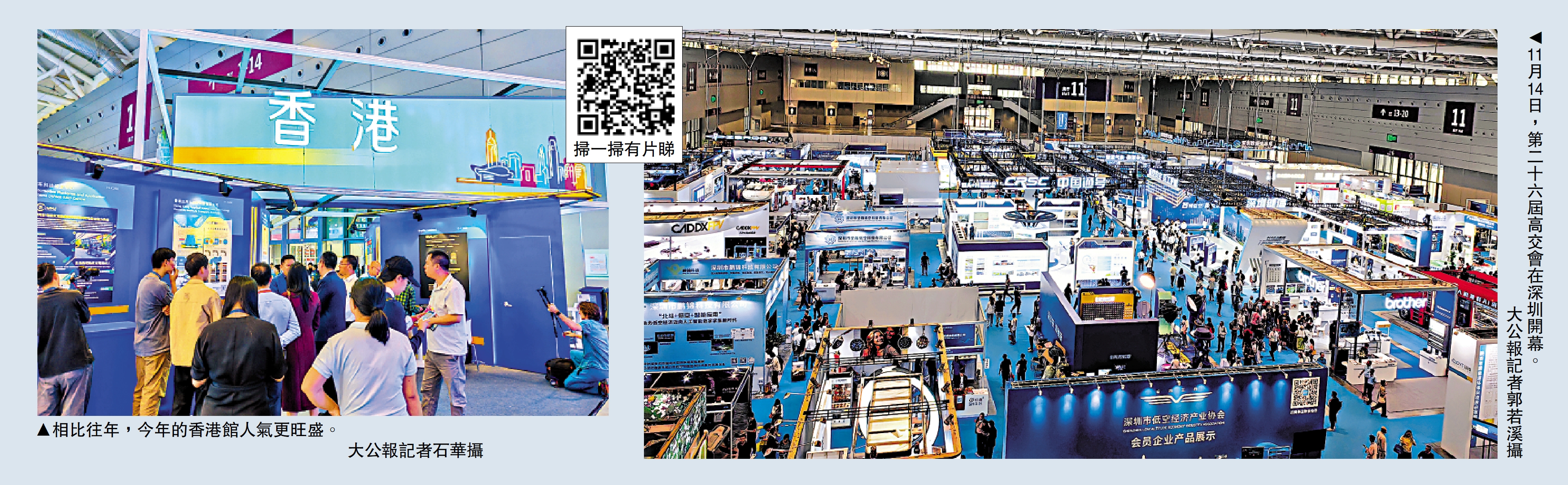 11月14日,為期三天的第二十六屆中國國際高新技術成果交易會(高交會)在深圳國際會展中心盛大開幕,來自全球100餘個國家和地區的5000餘家知名企業與國際組織參展參會。其中,香港館以獨特的創新生態和前沿科技產品成為本次展會的矚目焦點。