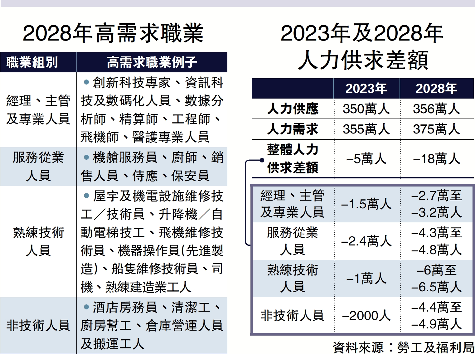 香港人口老化進一步擴大勞動人口缺口。政府公布本港最新的人力推算報告,指出本港勞動力求過於供,預計人力缺口由2023年的5萬,擴大至2028年18萬人,五年間擴大約三倍,其中最缺乏的是熟練技術人員,達6萬至6.5萬人,佔比逾三分之一,包括機電設施維修技工、建造業工人、司機等,政府表示會持續適度引入勞工以及加強本地培訓。