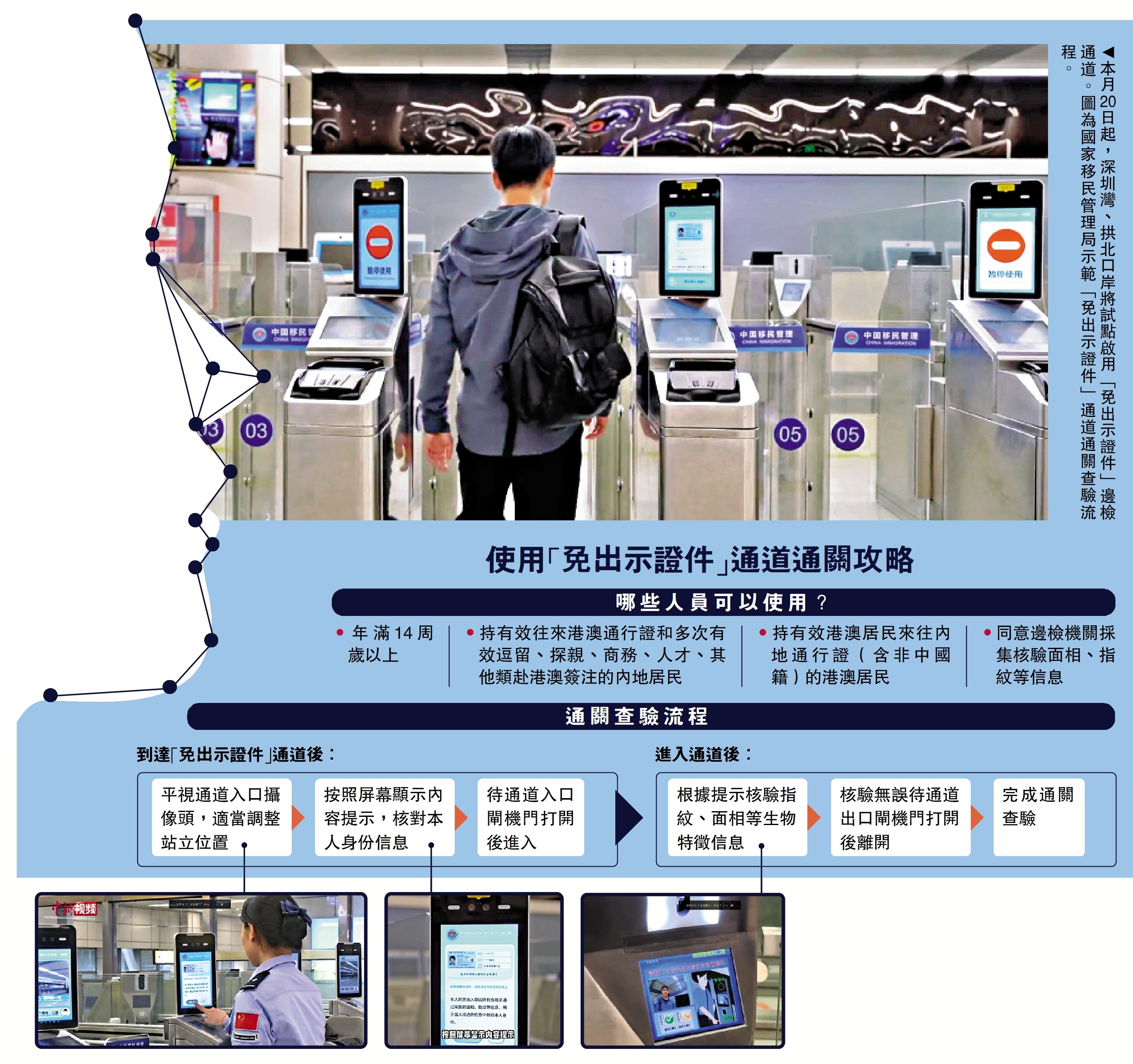 根據公告,年滿14周歲以上,持有效往來港澳通行證和多次有效逗留、探親、商務、人才、其他類赴港澳簽注的內地居民,以及持有效港澳居民來往內地通行證(含非中國籍)的港澳居民,且同意邊檢機關採集核驗面相、指紋等信息的,可選擇使用邊檢現場「免出示證件」通道通行,無需出示實體出入境證件。