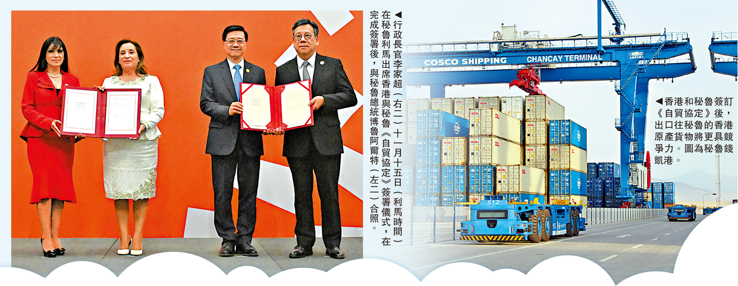 亞太區經濟合作組織領導人非正式會議正在秘魯利馬舉行。當地時間11月15日,在行政長官李家超和秘魯總統博魯阿爾特見證下,商務及經濟發展局局長丘應樺與秘魯外貿和旅遊部長Úrsula Desilú León Chempén簽訂《自由貿易協定》。李家超表示,深信香港與秘魯將進一步促進雙向投資流動,帶動雙方經濟發展。