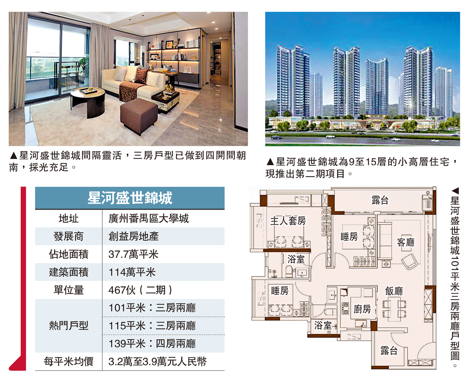 位於廣州番禺區大學城的星河盛世錦城,以其超高的性價比,成為大灣區的焦點樓盤之一。項目共分五期,目前銷售第二期,每平米均價由3.2萬至3.9萬元(人民幣,下同),近期特別推出的「工程抵押房」更低至2.7萬元起,面積99平米三房單位入場費約260萬元(約280萬港元)。