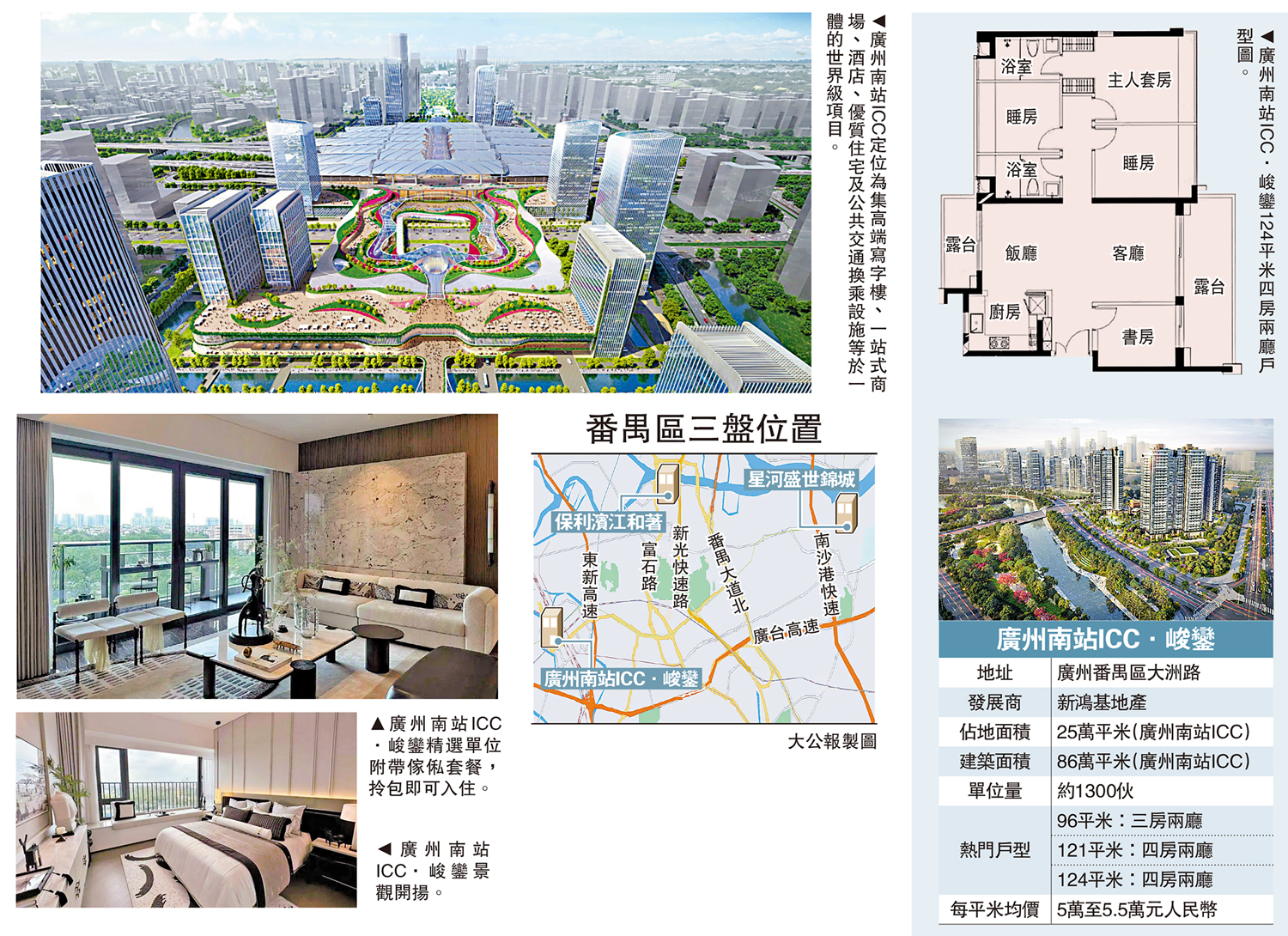 廣州南站ICC是新地在大灣區打造的第二座綜合體,定位為集合高端寫字樓、一站式商場、酒店、優質住宅及公共交通換乘設施等於一體的世界級TOD(公共交通導向開發)項目。廣州南站作為大灣區的核心樞紐,連接廣州、香港、深圳和澳門,區域內交通網絡四通八達,最快48分鐘到香港西九龍,被視為大灣區發展的關鍵樞紐節點。