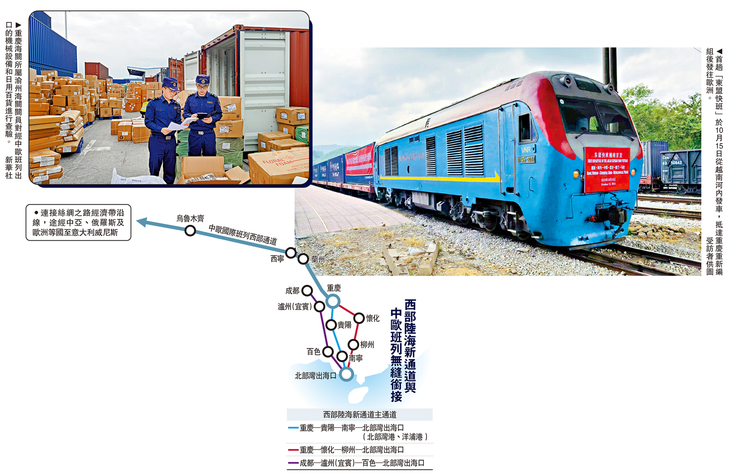 10月25日,伴隨着清脆的汽笛聲,一列早些時候從越南河內發車,裝載汽車電子零配件等貨物的「東盟快班」駛出重慶團結村中心站,2周後列車抵達波蘭馬拉舍維奇,比以往亞歐跨境運輸縮短5至10天。這列首趟「東盟快班」的開行,標誌着西部陸海新通道與中歐班列(渝新歐)兩大貿易通道在重慶實現「無縫銜接」,為解決多式聯運「最後一公里」提供了新思路與操作樣板;也為中國深化與東盟、歐洲地區的產業鏈供應鏈合作創造了新場景,開啟了亞歐貿易往來的便捷新通道。\大公報記者 韓毅