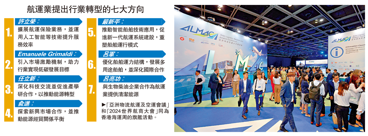 隨着全球對氣候變化和可持續發展的關注日益加深,航運業近年積極向高增值航運服務業拓展,並積極向智能化、綠色化轉型。在昨日舉辦的2024世界航商大會主論壇上,多位來自全球航運及相關產業的領袖從七方面為航運智能化、綠色化提供建議,包括拓展航運保險、推動智能船舶技術應用、引入市場激勵機制、優化船舶運力結構等,並認為通過技術創新與深化合作,香港將從綠色航運的發展中受益。\大公報記者 蔣夢宇