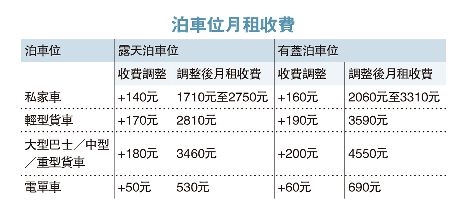 房委會轄下停車場私家車泊車位的月租收費,按照停車場租用率分為三個層級,提供不同的折扣。月租方面,私家車露天車位加140元,有蓋車位加160元,輕型貨車則分別加170及190元。時租收費方面,私家車、輕型貨車及電單車的時租泊車位將上調1元;私家車泊車位的「日泊」和「24小時泊」收費則分別上調10元及20元。
