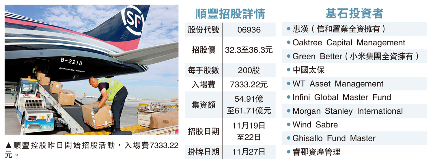 【大公報訊】再有大型公司選擇港股市場IPO。全球第四大綜合物流服務商順豐控股(06936)昨日開始招股活動,招股價32.3至36.3元,集資最多61.71億元。按每手200股,入場費7333.22元。多位重量級基石投資者認購順豐新股,包括Oaktree、信置及小米等。分析員指出,由於順豐擬發售的H股相比A股股價有較大折讓,故可以申購,上市首日可沽出鎖定利潤。綜合多間券商數據,認購順豐的孖展金額已超過20億元,首日已超額認購兩倍以上。