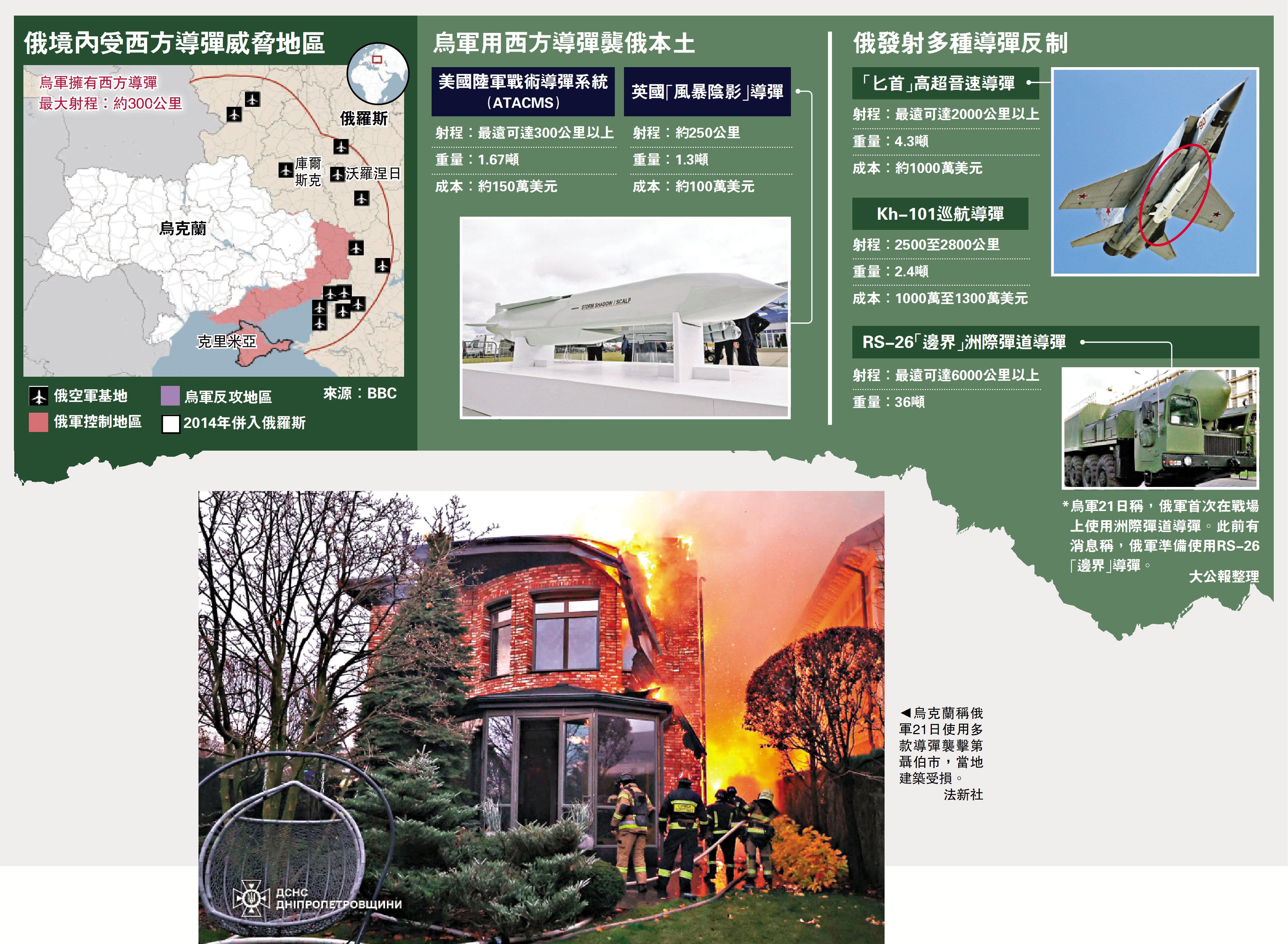 美國批准烏軍使用美製遠程導彈襲擊俄本土後,俄烏衝突烈度進一步上升。21日,烏克蘭空軍稱,俄軍使用包括洲際彈道導彈在內的多款導彈襲擊第聶伯市,這是本次衝突期間俄方首次動用洲際彈道導彈。消息人士稱,這枚洲際彈道導彈未攜帶核彈頭。俄總統新聞秘書佩斯科夫表示,他對此無可奉告。俄國防部表示,俄防空系統摧毀了兩枚英國提供給烏克蘭的「風暴陰影」導彈。