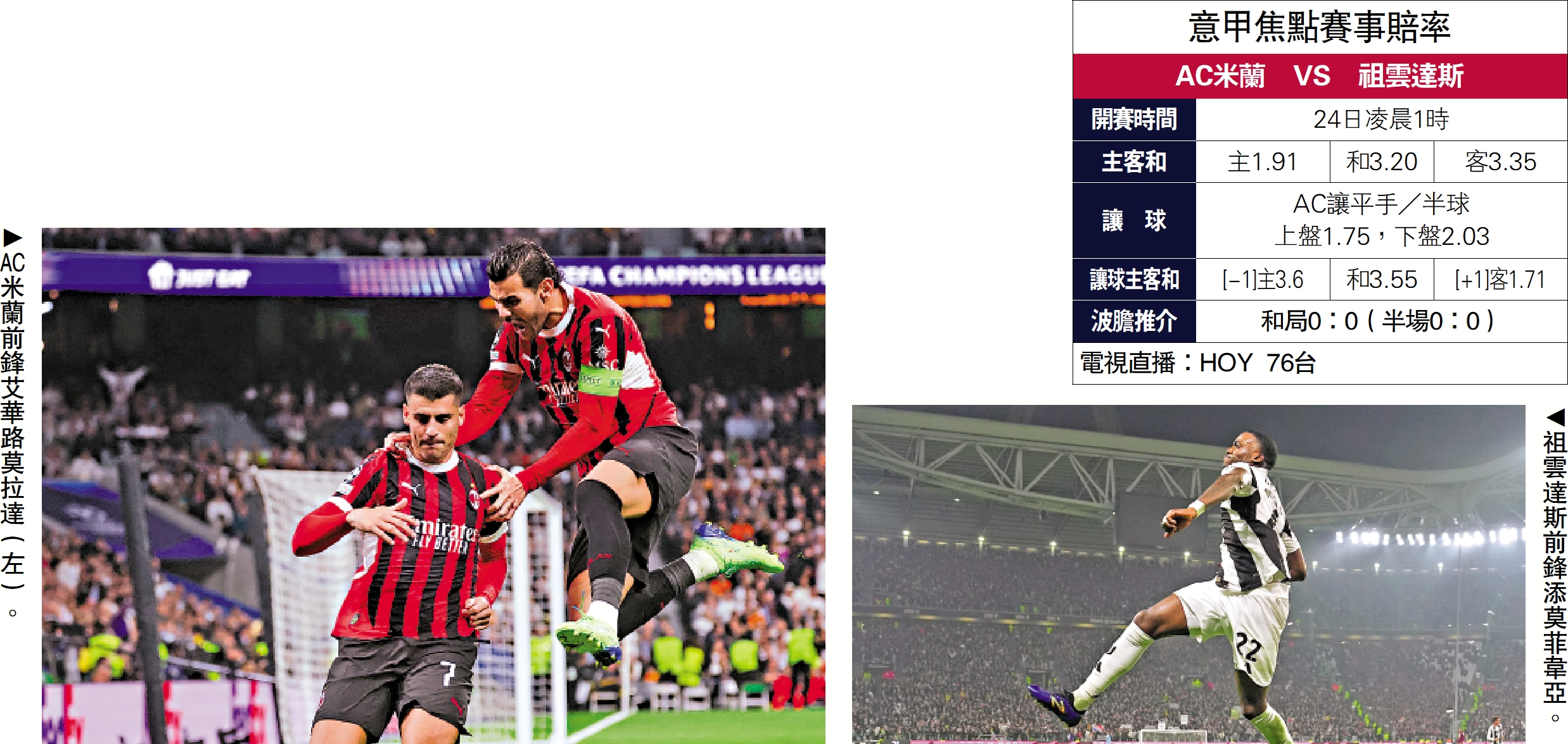 【大公報訊】本港球迷周末開始終可透過免費電視觀看意甲直播,明晨就有豪門大戰好戲,由AC米蘭主場對祖雲達斯,後者今季聯賽雖未逢敗績但卻是「和波專家」,今戰隨時又與死敵平分秋色,就買「主客和」的和。(HOY 76台明晨1時直播)