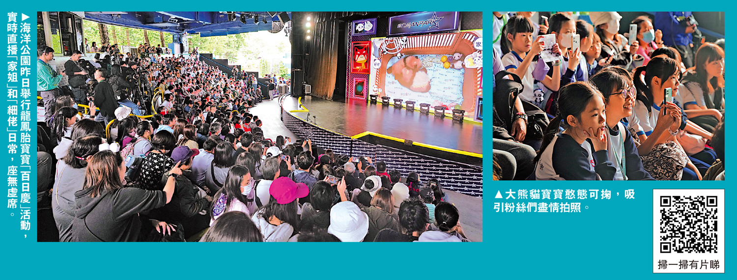 大熊貓「盈盈」於8月15日誕下龍鳳胎,海洋公園於昨日及今日為一對寶寶舉行「百日慶」。大公報記者昨日在現場所見,園內氣氛熱鬧,有粉絲提早到達等候入場,園方向入場人士派發豬腳薑醋和紅雞蛋。