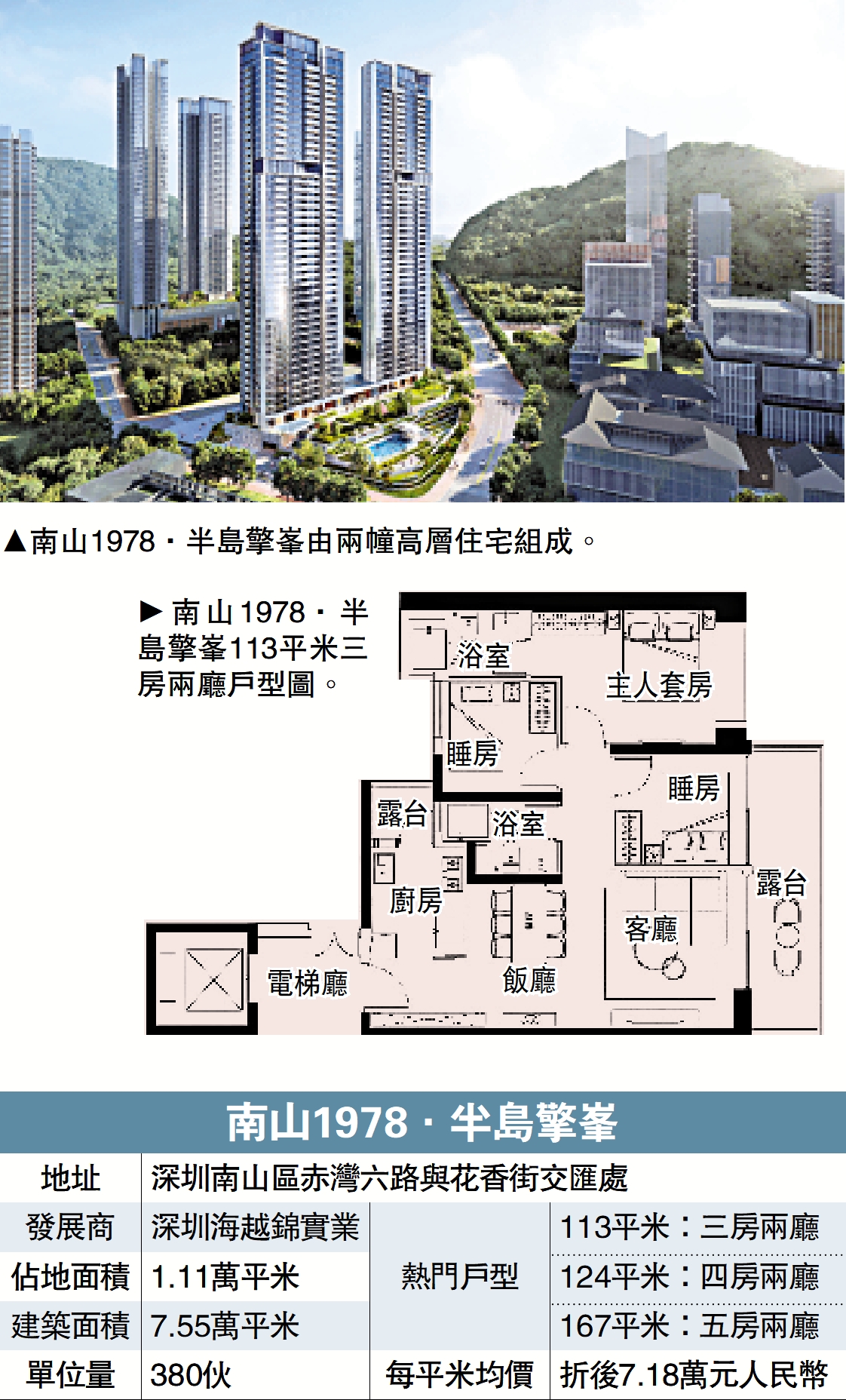 赤灣片區正在形成南山區新一代高品質居住區,二手放盤每平米叫價最高達12萬元(人民幣,下同)。南山1978·半島擎峯由兩幢高層住宅組成,提供380伙,預計2025年10月交樓。項目主打大戶型,單位面積由113至167平米,間隔介乎三房兩廳至五房兩廳,折後每平米均價約7.18萬元。