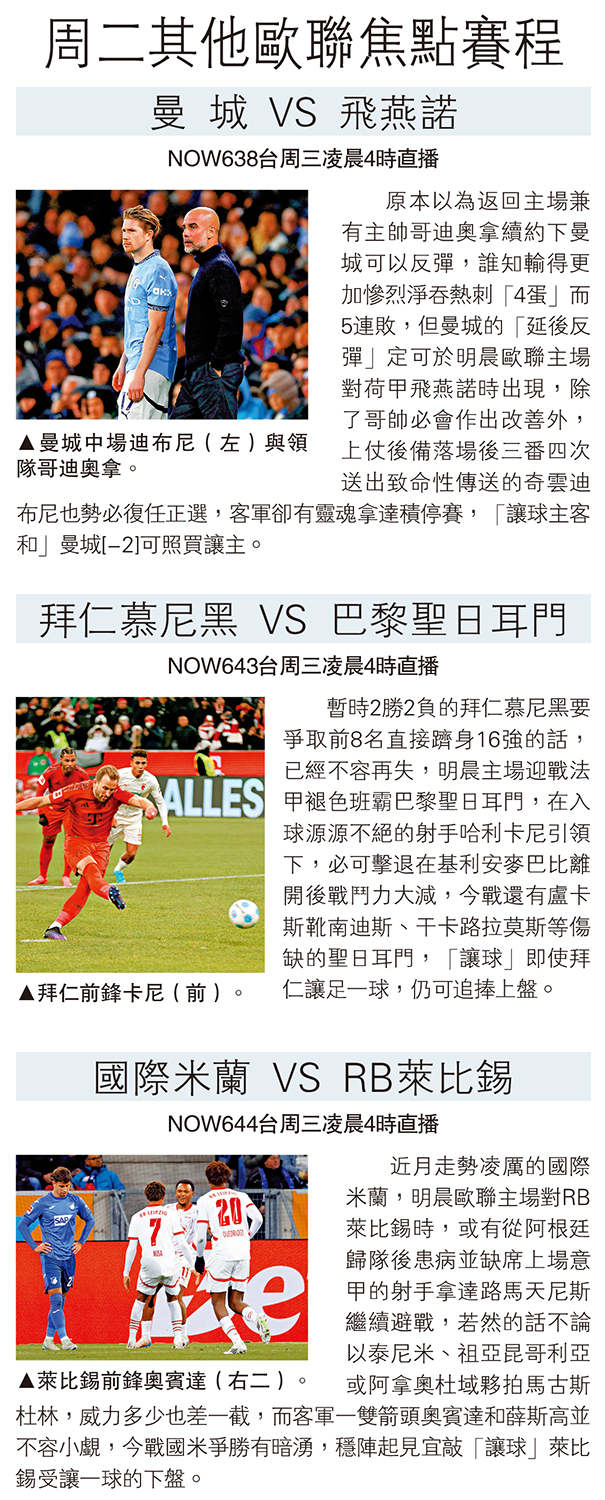暫時2勝2負的拜仁慕尼黑要爭取前8名直接躋身16強的話,已經不容再失,明晨主場迎戰法甲褪色班霸巴黎聖日耳門,在入球源源不絕的射手哈利卡尼引領下,必可擊退在基利安麥巴比離開後戰鬥力大減,今戰還有盧卡斯靴南迪斯、干卡路拉莫斯等傷缺的聖日耳門,「讓球」即使拜仁讓足一球,仍可追捧上盤。
