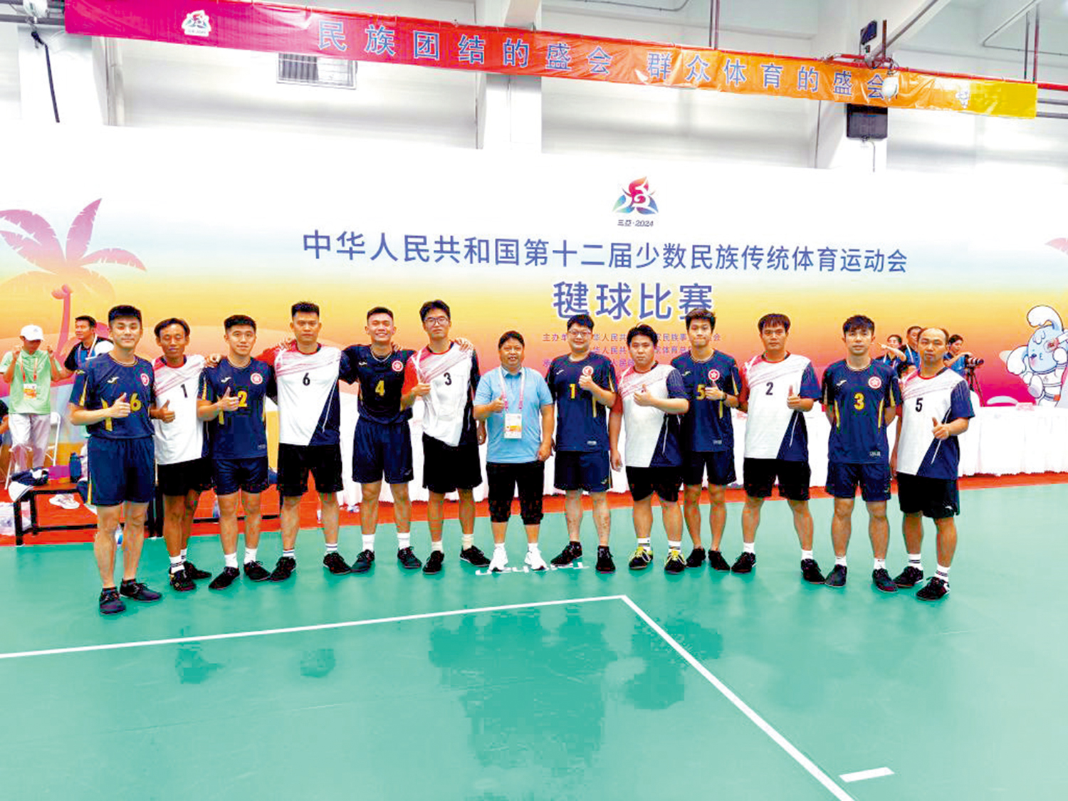 23日,第12屆全國少數民族傳統體育運動會毽球項目在海南三亞中瑞酒店管理職業學院開賽,鬥志昂揚的西藏隊與沉穩老練的香港隊在男子3人小組賽中相遇。賽後,雙方隊員隔着球網微笑擊掌,香港隊隊員給西藏隊隊員送上禮物,隨後雙方親密合影。