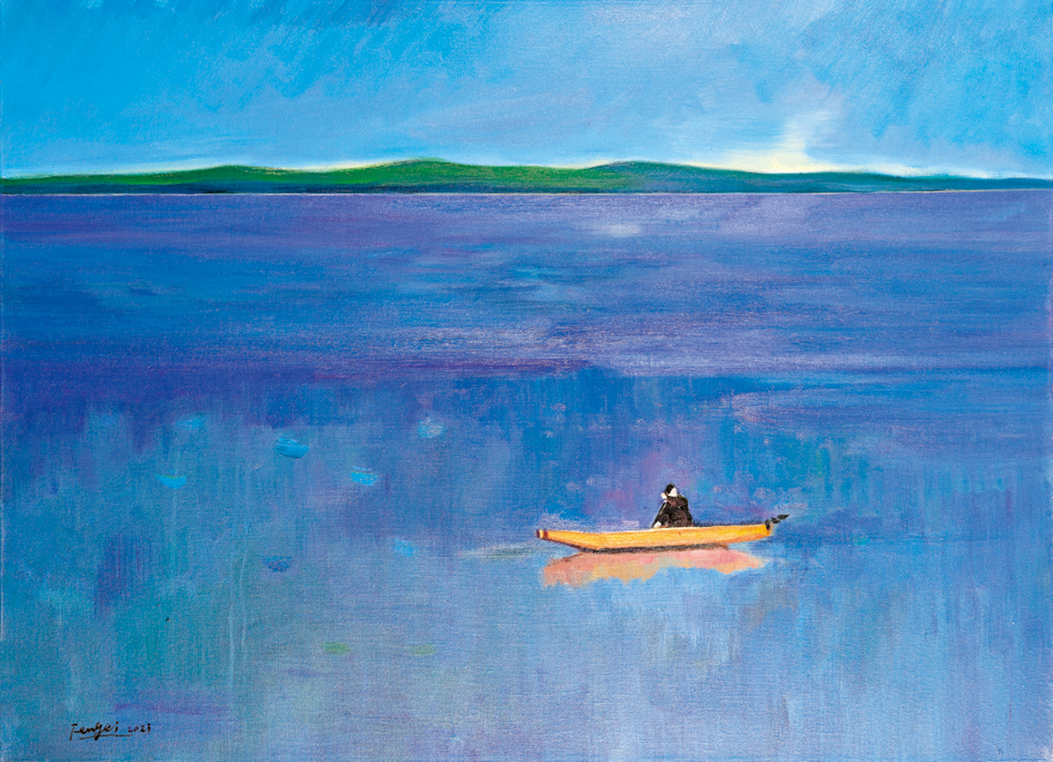 在香港中央圖書館的展廳裏,一幅油畫作品躍然眼前,令我眼前一亮。那是一幅名為《點亮》的佳作。這是福建畫院青年油畫家馮巍應邀參加中華人民共和國成立七十五周年大型書畫作品展「藝脈相承,夢想啟航」的一幅力作。畫面中十分簡潔,但是又令人充滿詩意和禪味的感覺。一位孤獨的划船者正划着一隻小小的橙黃色的船隻,在藍紫色的江面上緩緩前行。江水如鏡,冷灰色彩調子的畫面顯得寧靜而神秘。遠處的青山依稀可見,只是淡淡的外輪廓,一隻小舟成了畫面的中心,劃破寧靜,船與人,成了這個世界的孤獨影子,划船者全神貫注,手中的槳子激起層層漣漪,他要去哪裏?他在做什麼?