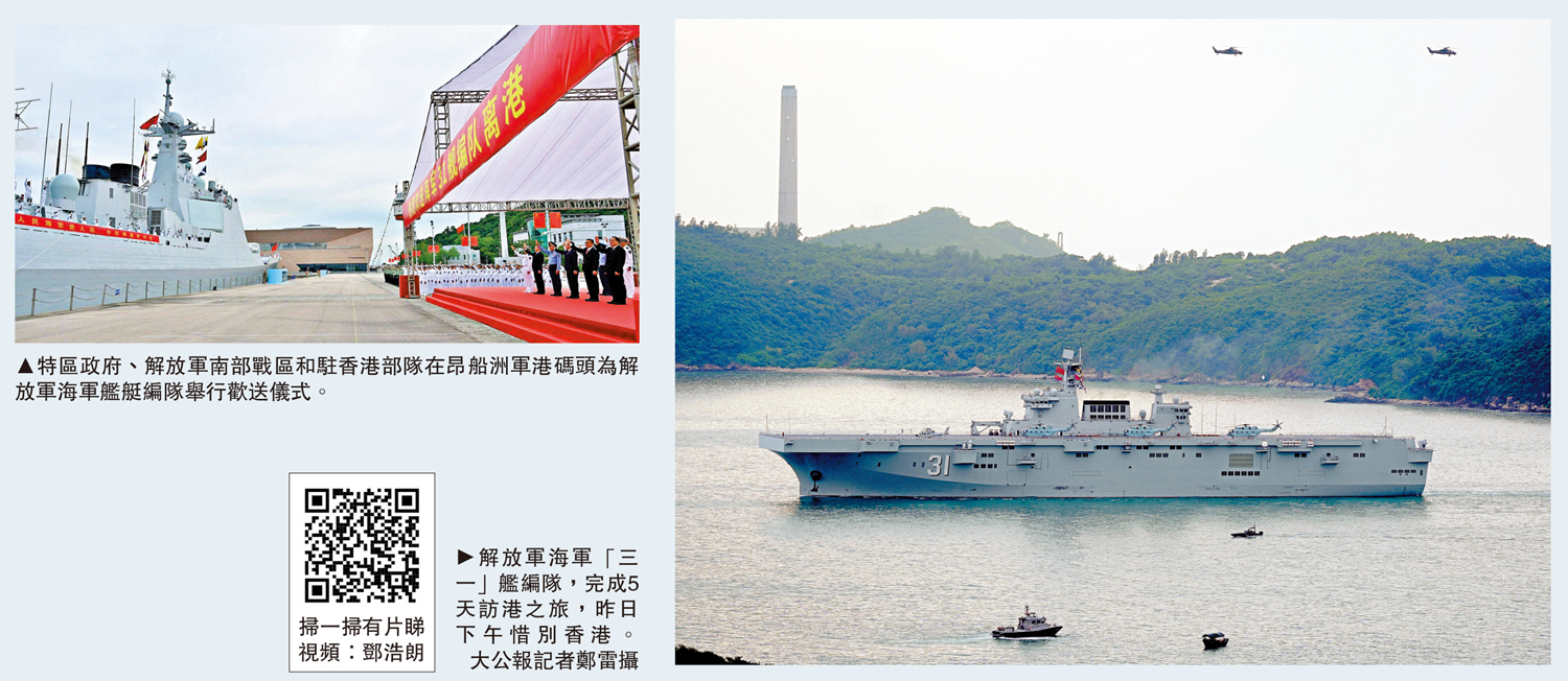 ▲特區政府、解放軍南部戰區和駐香港部隊在昂船洲軍港碼頭為解放軍海軍艦艇編隊舉行歡送儀式。