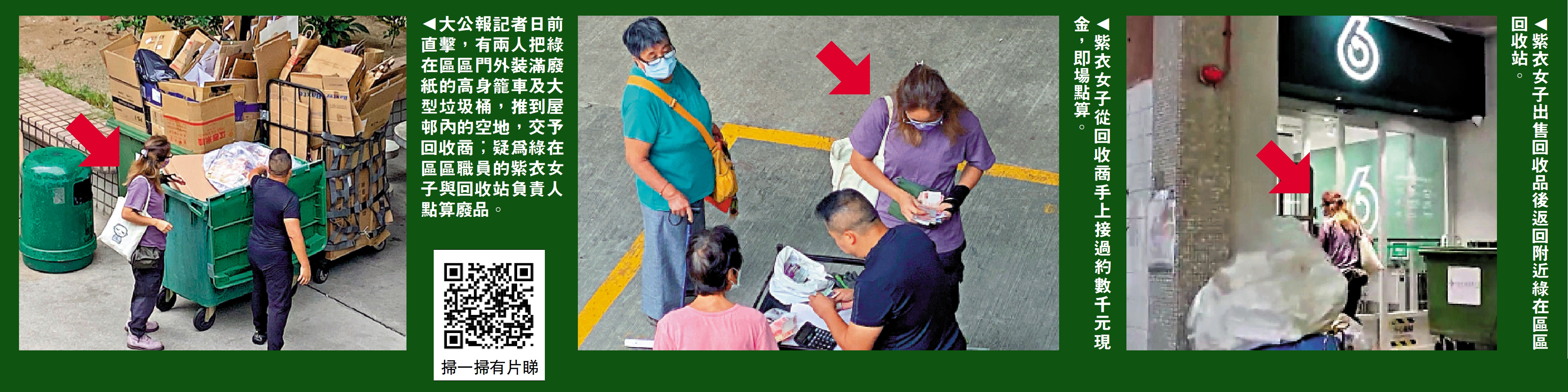 不久,一名身穿紫色襯衫的女子,與回收商查看「6仔店」的三籠廢紙及短暫交談,回收商再把一大袋「6仔店」的鋁罐與在其他回收鋁罐放在一起,二人再走到收銀台,回收商遞出一張寫有數字的紙張講解交代,女子查看後點頭,從環保袋中取出一個拉鏈錢袋,接收回收商交付的一疊現金。女子仔細點算目測約3000元現金後,將之放入錢袋便離開,返回鄰近的「6仔店」。