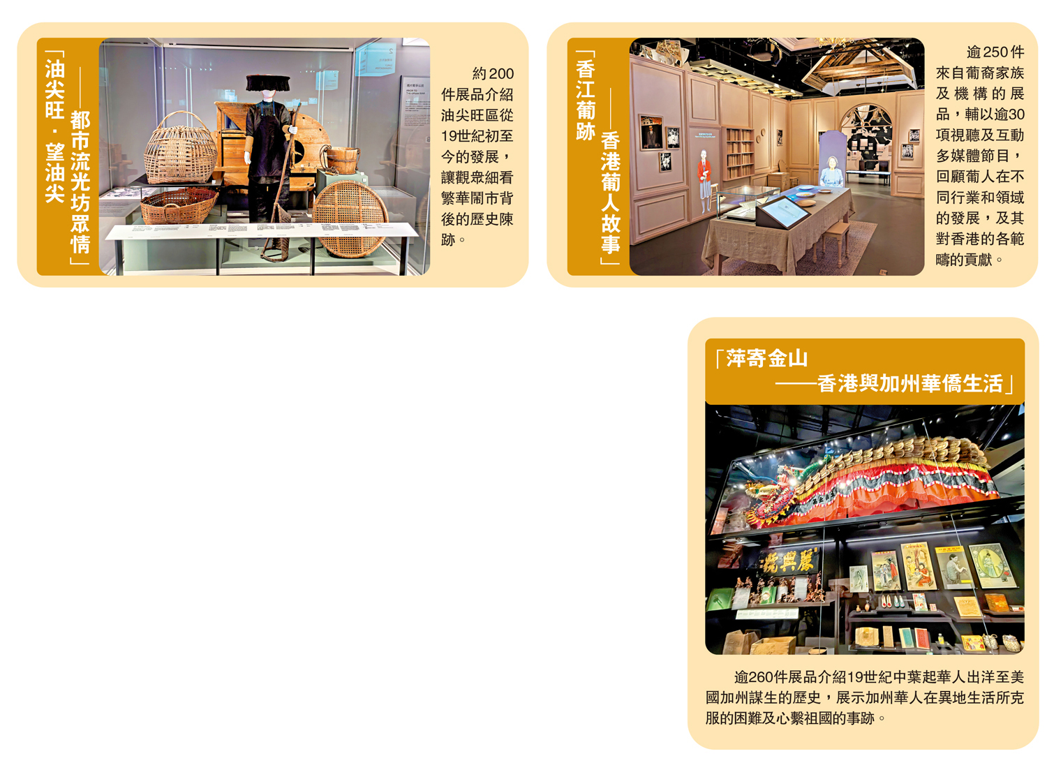 香港歷史博物館今日起展出「香港多面體」展覽系列,這是歷史博物館更新常設展覽的第一階段,包括三個新展覽:「油尖旺·望油尖─都市流光坊眾情」、「香江葡跡─香港葡人故事」及「萍寄金山─香港與加州華僑生活」。「香港多面體」以專題內容形式,就本地的社區發展、外籍族群及海外華人的聯繫等課題作深入探討,務求更全面地介紹香港獨特的城市發展脈絡及其賴以成功的因素。\大公報記者 李兆桐(文、圖)