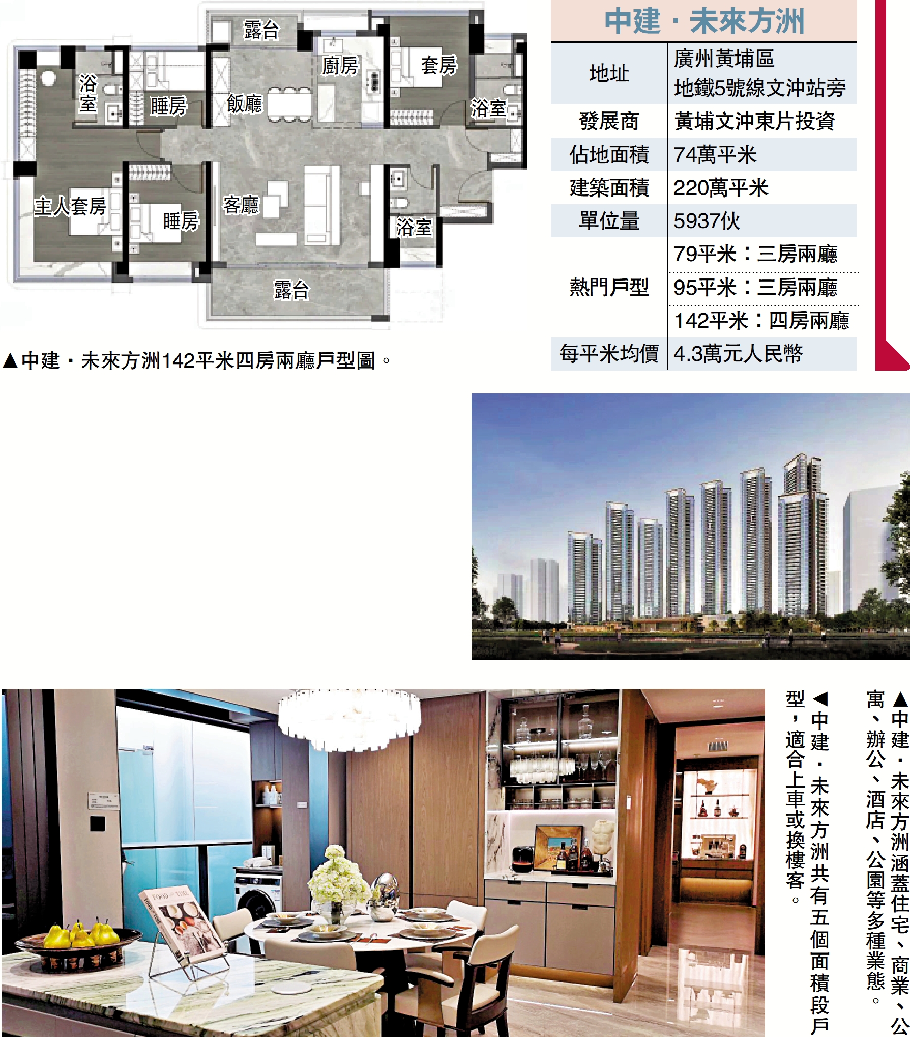 中建·未來方洲位於老黃埔板塊,屬於文沖東的舊改項目,佔地約74萬平米,建築面積約220萬平米,涵蓋住宅、商業、公寓、辦公、酒店、公園等多種業態。整個舊改分三個組團,首推的融資區就在黃埔東路邊上。
