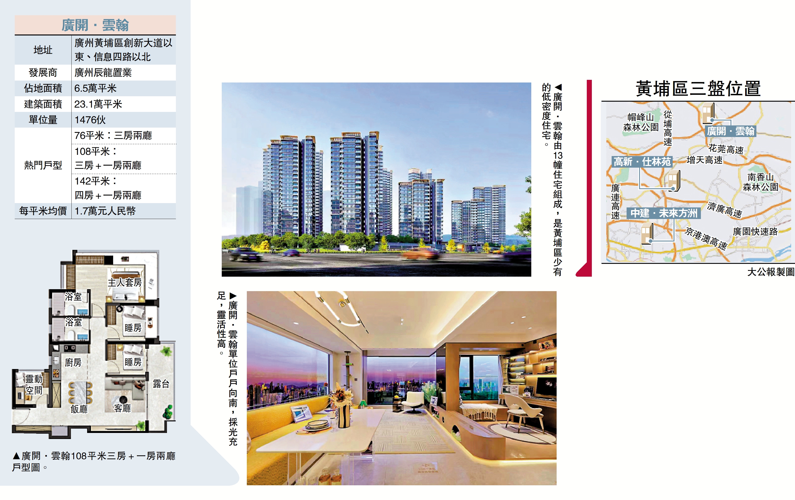 廣開·雲翰為黃埔區中新知識城首個享受到樓市政策紅利的新盤,於2023年10月由廣開控股財團以16.534億元(人民幣,卜同)奪得地皮,每平米樓面地價僅11239元,單位定價空間相當大。項目總建築面積23.1萬平米,由13幢住宅組成,提供1476伙,單位全部向南,每平米均價1.7萬元(約1.82萬港元),是黃埔區少有的低密度、高品質學府樓盤,具備得天獨厚的自然資源和區位優勢。
