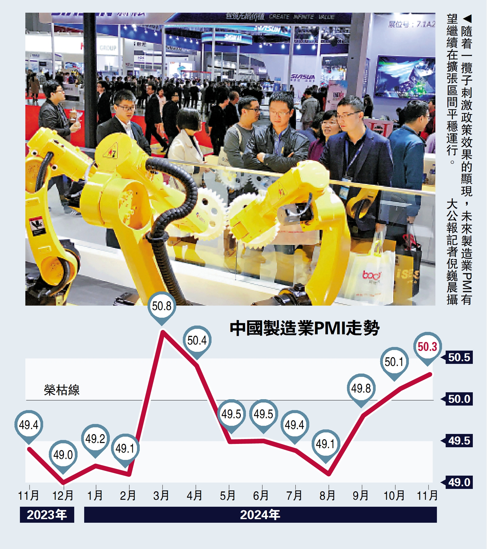 分析稱,隨着一攬子刺激政策效果的持續顯現,市場預期和信心同步提升,預計本季中國GDP按年增長5.3%,全年GDP有望實現5%左右增長,未來製造業PMI料在擴張區間平穩運行。/大公報記者 倪巍晨上海報道