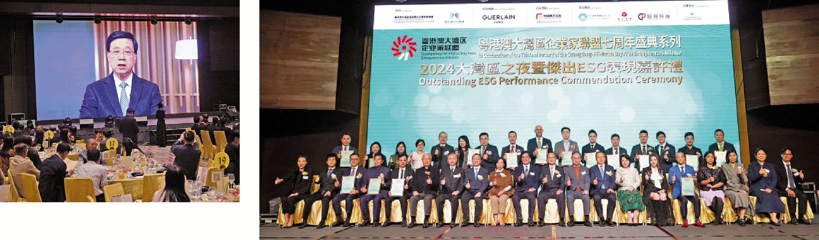 粵港澳大灣區企業家聯盟於今年8月成立了ESG委員會,期望為香港以至整個大灣區綠色經濟發展,為中華振興及功在千秋的可持續發展,作出新的貢獻。聯盟遴選出15家持續深耕ESG發展且成績卓著的機構,當中包括香港上海滙豐銀行、中國銀行(香港)、中國萬天控股、信德集團等本地大型知名企業和機構,所涉行業涵蓋公共事業、科技、醫療、環保團體等多個領域。當晚,由黃偉綸、蔡冠深、曾國衞一同為各機構代表頒授「大灣區傑出ESG表現機構」嘉許狀。