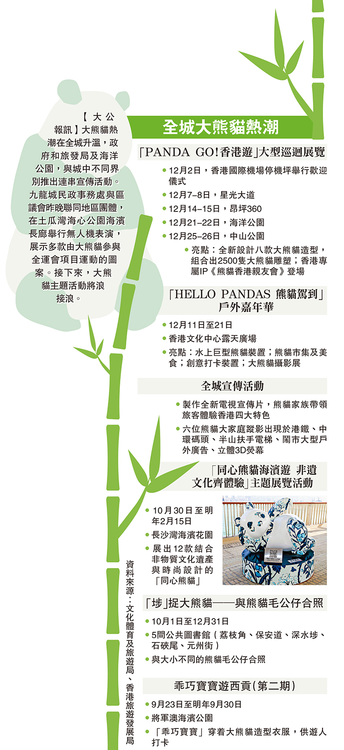 【大公報訊】大熊貓熱潮在全城升溫,政府和旅發局及海洋公園,與城中不同界別推出連串宣傳活動。九龍城民政事務處與區議會昨晚聯同地區團體,在土瓜灣海心公園海濱長廊舉行無人機表演,展示多款由大熊貓參與全運會項目運動的圖案。接下來,大熊貓主題活動將浪接浪。