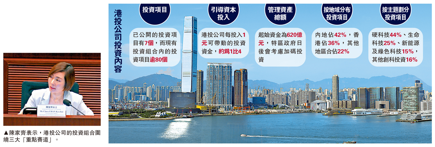 港投公司成立至今日子尚短,加上不少投資項目涉及市場敏感資料,對外公開的資料相對有限。陳家齊出席立法會財經事務委員會介紹工作進展時表示,至今對外公開的投資項目有7個,而在港投公司的投資組合裏面已經投了超過80個項目,主要圍繞三大「重點賽道」,即硬科技、生物科技,以及新能源/綠色科技。