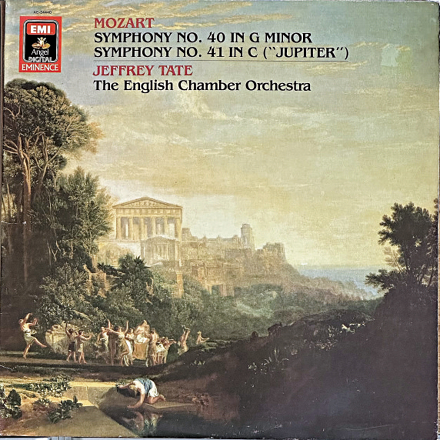 十二月五日即將迎來音樂神童代言人莫扎特逝世二百三十三周年。本周應景地推薦一張收錄其兩首著名交響曲的黑膠唱片。專輯屬於EMI旗下ANGEL廠牌在一九八五年發行的「Eminence」(卓越)系列,由英國著名指揮大師傑弗瑞·泰特爵士執棒英國室內樂團灌錄的莫扎特《G小調第40號交響曲,K.550》和《C大調第41號「朱庇特」交響曲,K.551》。唱片封套應景地選擇了一幅和莫扎特交響曲主題相關的畫作:英國十九世紀浪漫主義風景畫巨匠J.M.W.透納的神話題材作品《重建後的朱庇特·潘尼利烏斯神廟》。