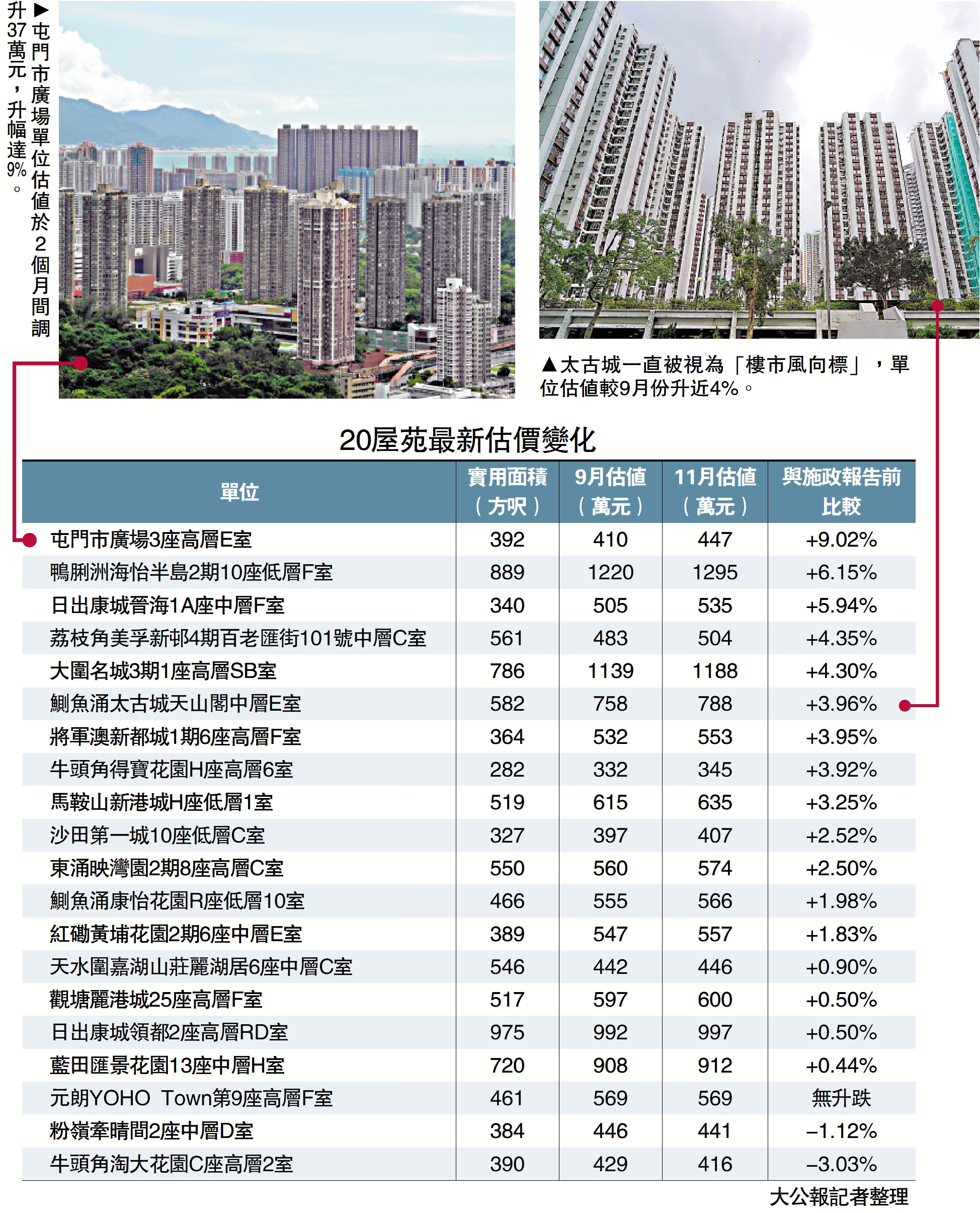 升幅最大的單位為屯門市廣場3座高層E室,實用面積392方呎,今年9月底估值是410萬元,施政報告於10月中旬公布後,單位10月底估值調升至426萬元,上月底再漲至447萬元,其估值於短短2個月間獲調升37萬元,升幅達9%。