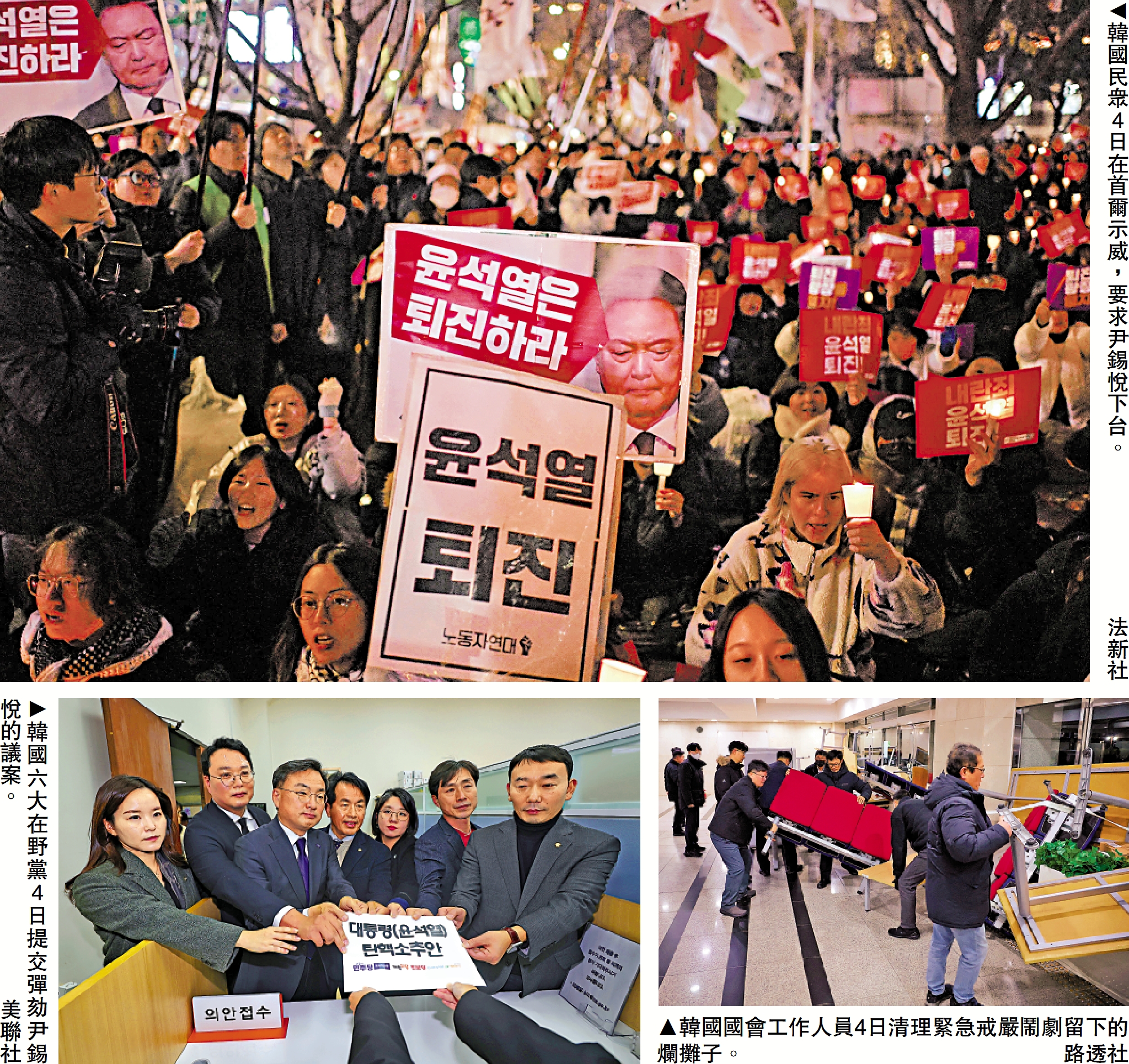 •4日下午,韓國六大在野黨向國會提交關於彈劾總統尹錫悅的議案。彈劾案預計將於5日提上國會全體會議議程,並在6至7日之間進行表決。