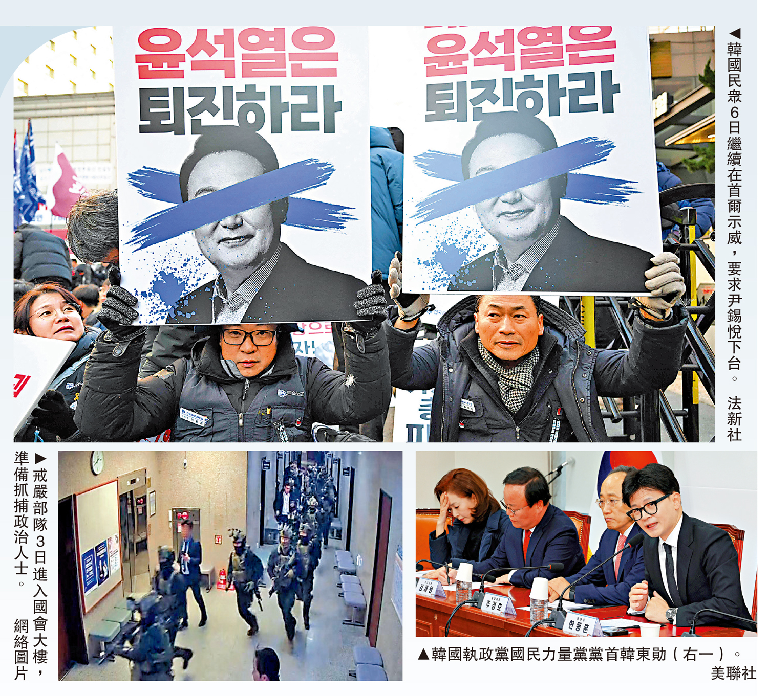 韓國總統尹錫悅彈劾案,預計最快會在當地時間7日下午5時(本港時間下午4時)左右表決。尹錫悅所屬的執政黨國民力量黨5日表示反對彈劾案,但該黨黨首韓東勛6日表示,有必要盡快讓尹錫悅停止執行總統職務。截至6日晚,已有至少兩名執政黨議員公開表示支持彈劾案。分析認為,國會彈劾投票為不記名投票,執政黨只要有8人倒戈就能通過彈劾案,因此尹錫悅彈劾案獲通過的可能性增加。