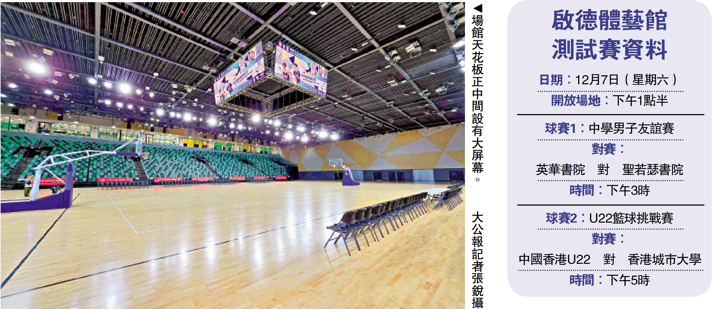 啟德體育園內可容納10000名觀眾的啟德體藝館將於今午3時起進行兩場籃球測試賽,分別是下午3時進行的中學男子友誼賽,由英華書院對陣聖若瑟書院,以及下午5時上演的全運會中國香港男子隊U22籃球挑戰熱身賽,由中國香港U22代表隊(U22港籃)迎戰香港城市大學。這是體藝館的首次體育賽事測試賽,當局預計有2000名觀眾。持票觀眾可於今天下午1時半開始入場,主辦單位早前已經分發門票,現場將不設售票。\大公報記者 張銳