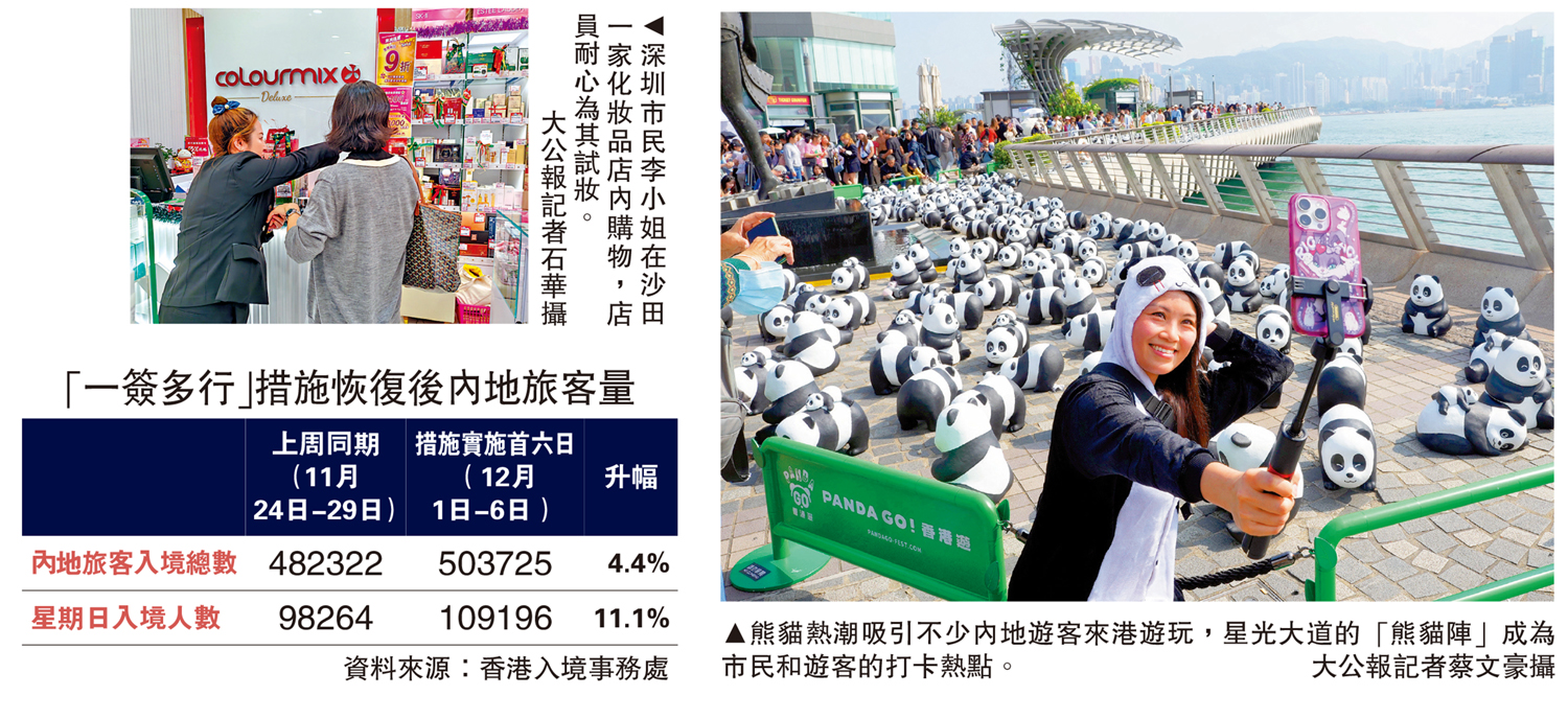 昨日尖沙咀海傍的大熊貓主題展覽現場,遊人摩肩接踵,不少人手持熊貓公仔或穿戴着大熊貓服飾。深圳旅客段先生和女朋友甜蜜自拍,他告訴記者,很久沒來香港,這次來到覺得街上特別熱鬧,很有節日氛圍,「一簽多行簽注真的很方便,相信會讓我們深圳居民更願意來香港。」
