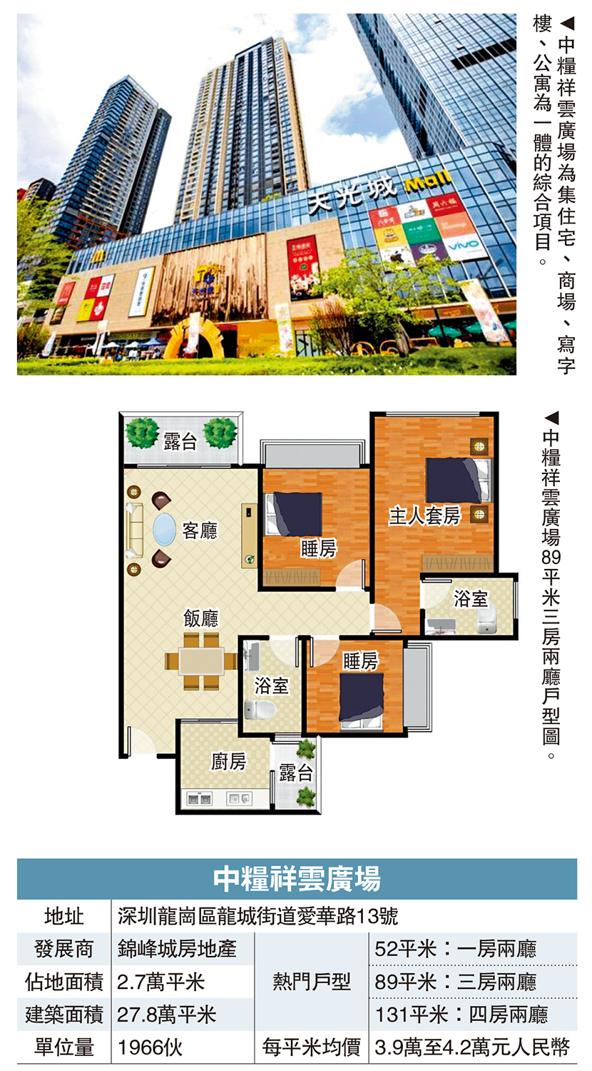 中糧祥雲廣場是一個集住宅、商場、寫字樓、公寓為一體的綜合項目,佔地2.7萬平米,建築面積27.8萬平米,分兩期發展,共6幢物業,其中3幢為住宅、2幢為公寓、1幢為寫字樓。