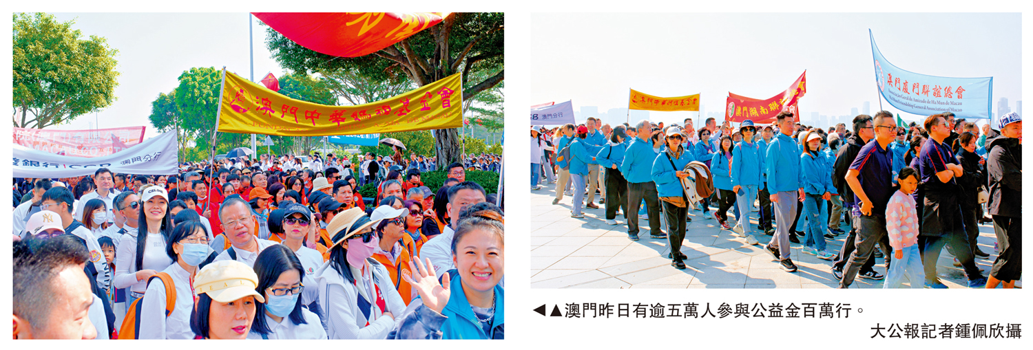 【大公報訊】記者鍾佩欣報道:第四十一屆公益金百萬行昨日(8日)舉行,以實體步行籌募善款,吸引逾五萬人參與。澳門行政長官賀一誠、全國政協副主席何厚鏵、澳門中聯辦副主任黃柳權、外交公署駐澳特派員劉顯法等主持起步儀式,國家奧運金牌運動員亦一同參與活動,沿途與市民揮手。截至12月7日,各界捐助善款逾1700萬元。