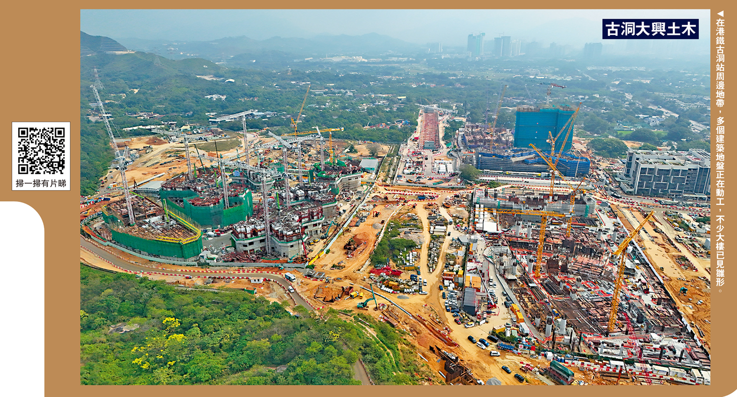 在古洞站周遭方圓約二平方公里的地方分布着多個大地盤,部分大樓已近封頂,有的已建了數層,有的正澆灌水泥石屎,林立的天秤不停吊運各種建築材料,工程車穿梭不停地運送物料,非常繁忙,工程如火如荼。