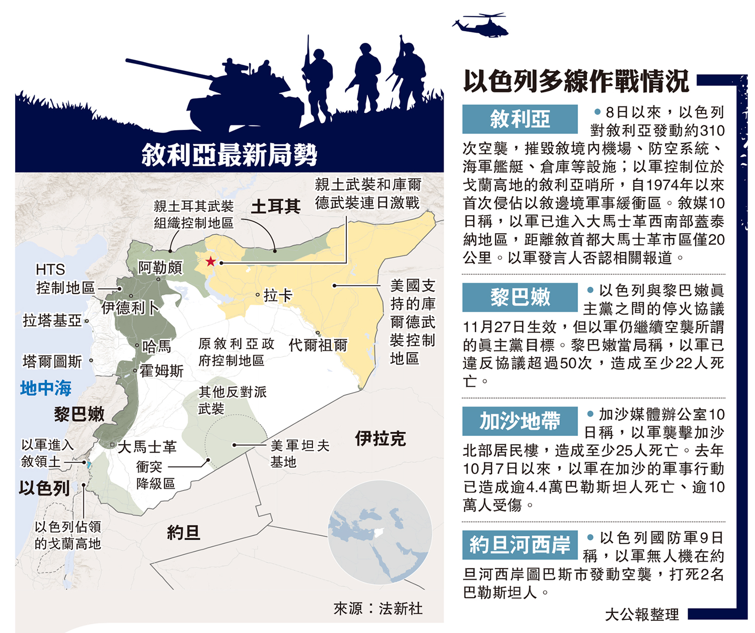 •8日以來,以色列對敘利亞發動約310次空襲,摧毀敘境內機場、防空系統、海軍艦艇、倉庫等設施;以軍控制位於戈蘭高地的敘利亞哨所,自1974年以來首次侵佔以敘邊境軍事緩衝區。敘媒10日稱,以軍已進入大馬士革西南部蓋泰納地區,距離敘首都大馬士革市區僅20公里。以軍發言人否認相關報道。