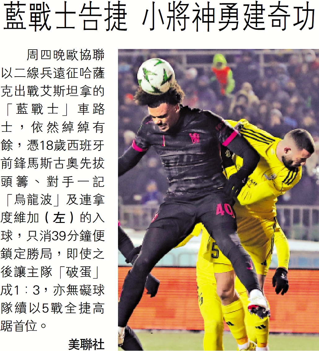 周四晚歐協聯以二線兵遠征哈薩克出戰艾斯坦拿的「藍戰士」車路士,依然綽綽有餘,憑18歲西班牙前鋒馬斯古奧先拔頭籌、對手一記「烏龍波」及連拿度維加(左)的入球,只消39分鐘便鎖定勝局,即使之後讓主隊「破蛋」成1:3,亦無礙球隊續以5戰全捷高踞首位。\美聯社