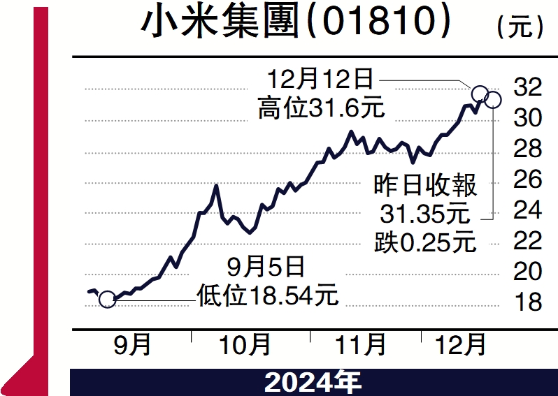 手機業務方面,根據2024年11月內地智能手機市場的廠商激活量數據及排名,小米(包括REDMI品牌)以530.4萬台的激活量位居榜首。業績方面,今年第三季手機收入按年增長14%至475億元,主要是智能手機的平均售價及出貨量增加所致,全球市佔率為13.8%,穩居前三。