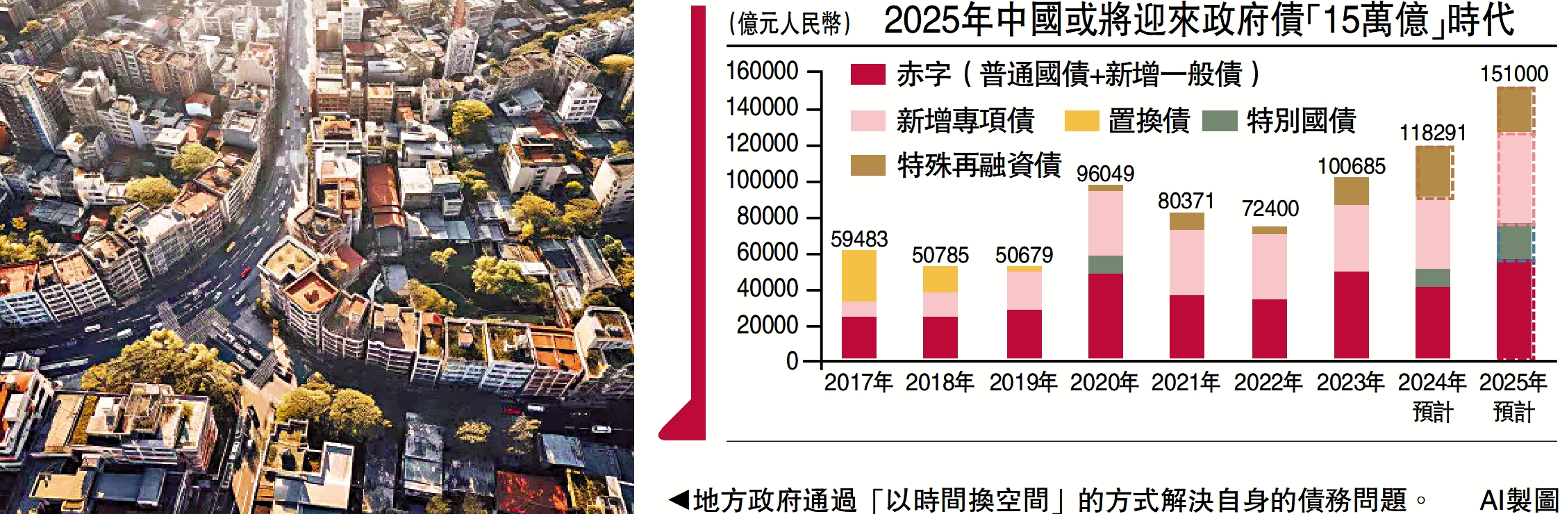 近年來,中國也曾階段性打破過3%的赤字紅線。如2020年在疫情衝擊下,財政減收情況較為嚴重,中央政府亦將赤字率提高至3.6%。新冠過後,財赤目標又重歸至3%以下。在地方政府層面,則長期秉承「控一般債、擴專項債」的財政理念,維持赤字率於較低水平。但由於可投項目稀缺、發債審批趨嚴,每年的專項債額度很難完成,同時地方政府的財政壓力又非常大,最終導致隱性債務快速擴張。據財政部公布數據,2023年地方隱性債務達14.3萬億元(人民幣,下同)。