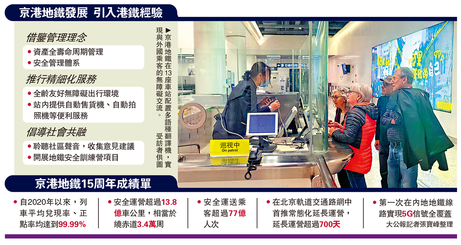 近年來,京港雙城合作愈加緊密。隨着北京率先推出Visa及Mastercard境外銀行卡「直刷」坐地鐵的新功能,京港地鐵除積極開展自動售檢票系統的調試,還檢查更新了車站和列車的中英文標識及廣播語言,配置多語種翻譯機,以精細化服務提升對境外遊客的吸引力。「團隊在內地和海外拓展業務,我們也將港鐵DNA和經驗帶到更多新的城市。」港鐵公司中國內地業務總監黃琨暐表示。\大公報記者 張寶峰