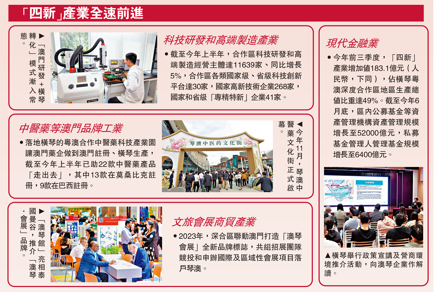 •今年前三季度,「四新」產業增加值183.1億元(人民幣,下同),佔橫琴粵澳深度合作區地區生產總值比重達49%。截至今年6月底,區內公募基金等資產管理機構資產管理規模增長至52000億元,私募基金管理人管理基金規模增長至6400億元。