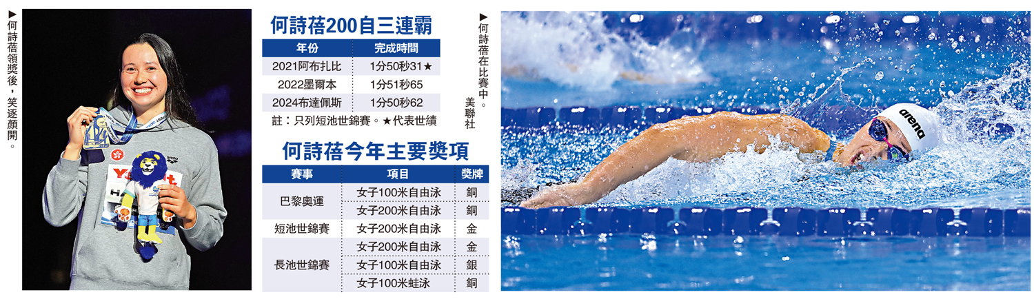 何詩蓓今年狀態保持勇銳,年初在卡塔爾多哈舉行的長池世界錦標賽勇奪女子200米自由泳金牌,這也是她個人職業生涯的首個長池世界冠軍。於今夏的巴黎奧運會,何詩蓓延續佳態,獲得女子100米、200米自由泳銅牌,將個人在奧運的獎牌數量增至4枚。隨後還在一系列的世界盃屢獲獎牌,表現出色。