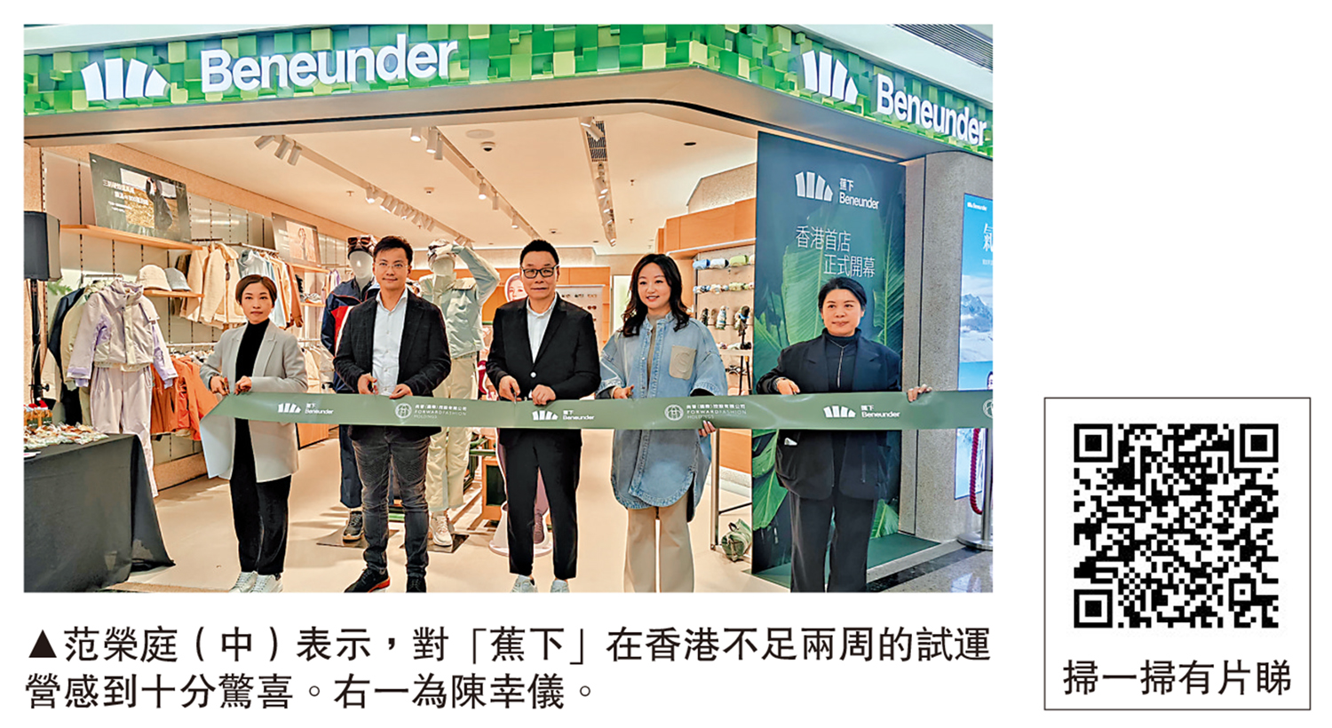 目前,計入今年港澳開設的3間蕉下店舖,大灣區共有10間蕉下實體店。范榮庭對於「蕉下Beneunder」香港不足兩周的試運營表示十分驚喜,認為蕉下在香港的熟知度較高,兩周已有客戶回購三次,對試營業階段的表現感到滿意。
