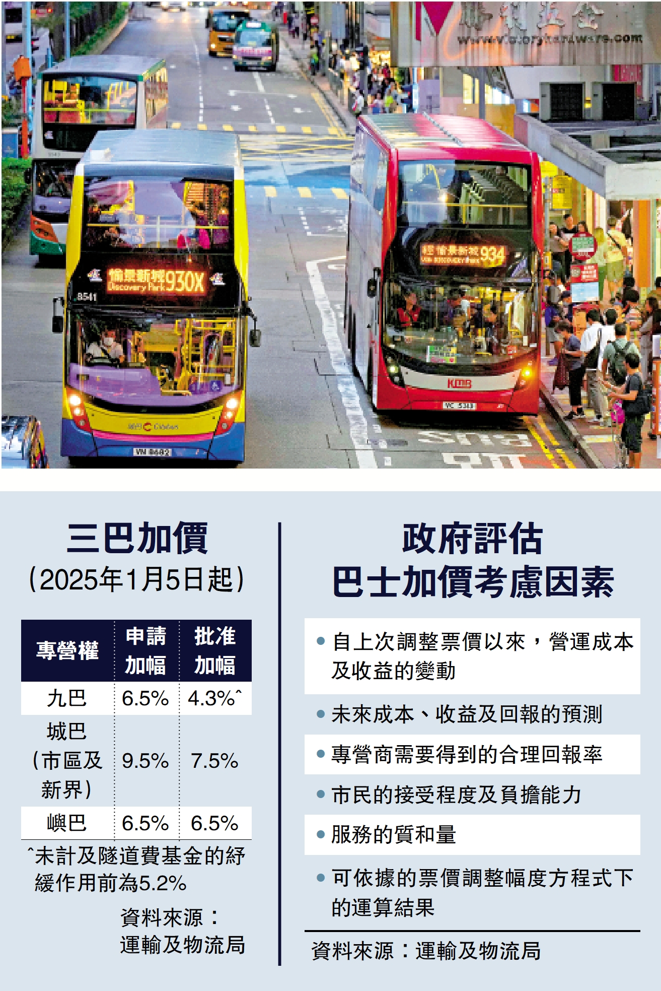 行政長官會同行政會議昨日批准三間巴士公司的加價申請,城巴加幅最高達到7.5%,九巴加價4.3%,新大嶼山巴士加6.5%,明年1月5日起實施。政府估計實施新收費後,約80%的乘客每程須多付的車費不超過0.5元。