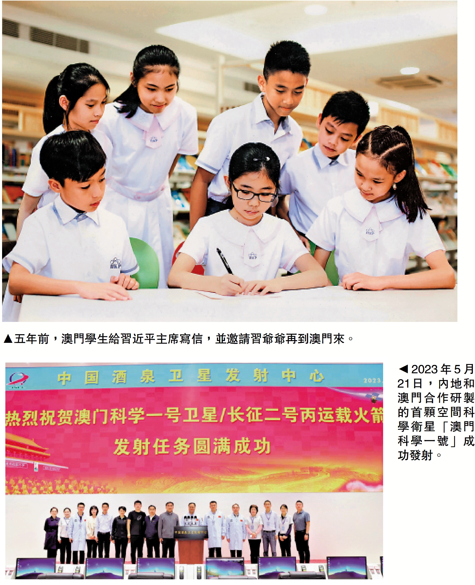 2023年5月21日,我國在酒泉衛星發射中心採用長征二號丙運載火箭,成功發射內地和澳門合作研製的首顆空間科學衛星「澳門科學一號」。參與衛星研製的澳門科技大學18名師生代表懷着喜悅的心情給習近平寫信。