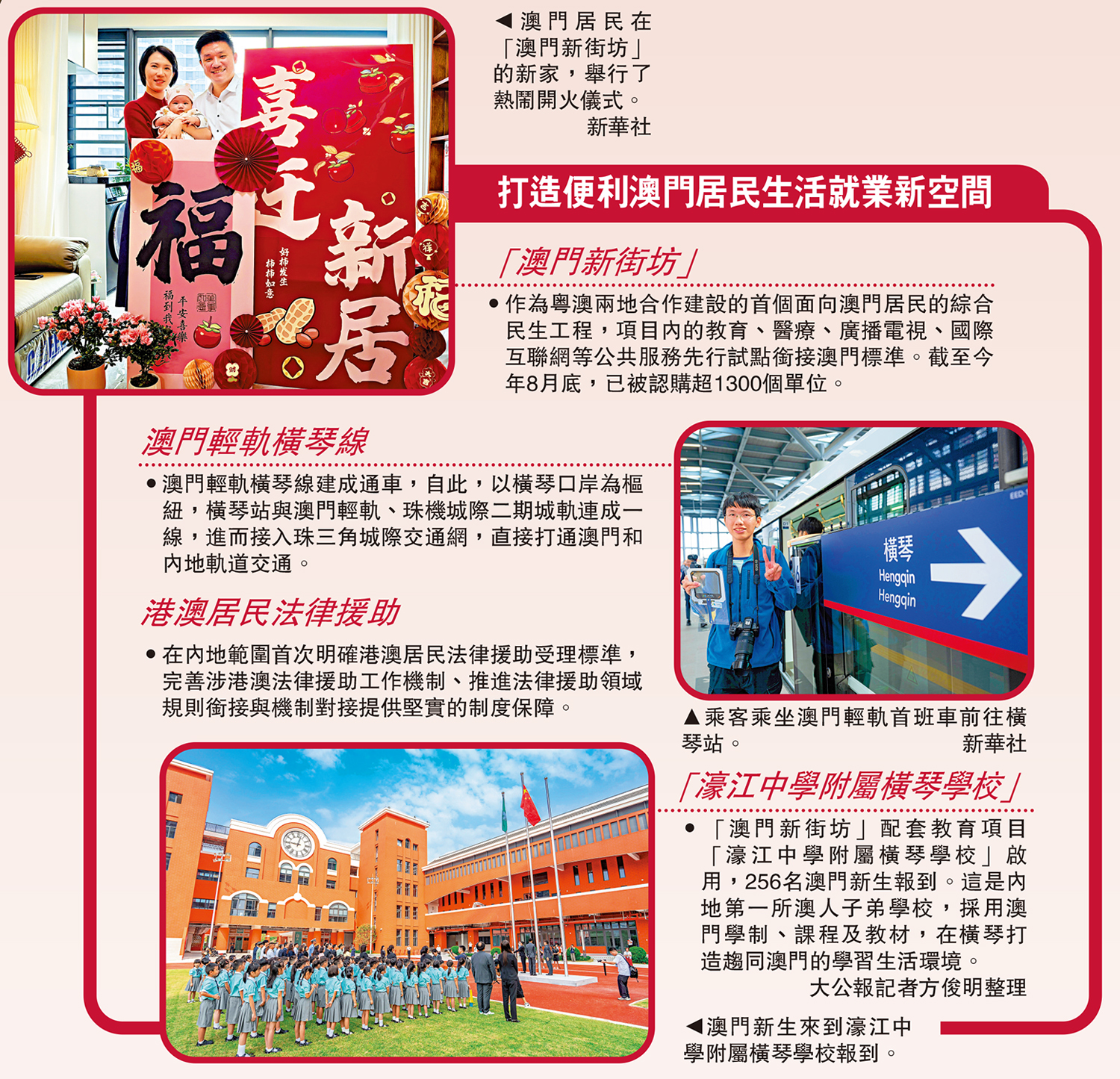 •作為粵澳兩地合作建設的首個面向澳門居民的綜合民生工程,項目內的教育、醫療、廣播電視、國際互聯網等公共服務先行試點銜接澳門標準。截至今年8月底,已被認購超1300個單位。