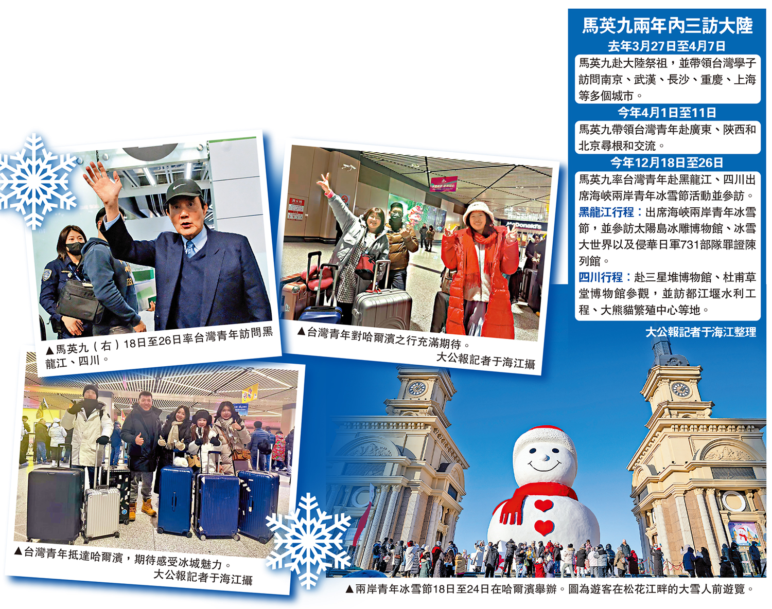 黑龍江省哈爾濱市18日迎來了一批期待已久的客人─由馬英九率領的台灣青年代表團。他們齊聚冰城,將共同出席即將舉行的海峽兩岸青年冰雪節。預計將有以台灣青年為主體的約1000名台胞參加冰雪節活動,與大陸青年一起感受冰雪的魅力。有首次到大陸的台灣青年表示,雖然哈爾濱天氣很寒冷,但接機的當地工作人員很熱情,讓人感到很溫暖。此外,逾千網友在網上「雲」接機,歡迎台灣同胞的到來。\大公報記者 于海江、吳千、王欣欣哈爾濱報道