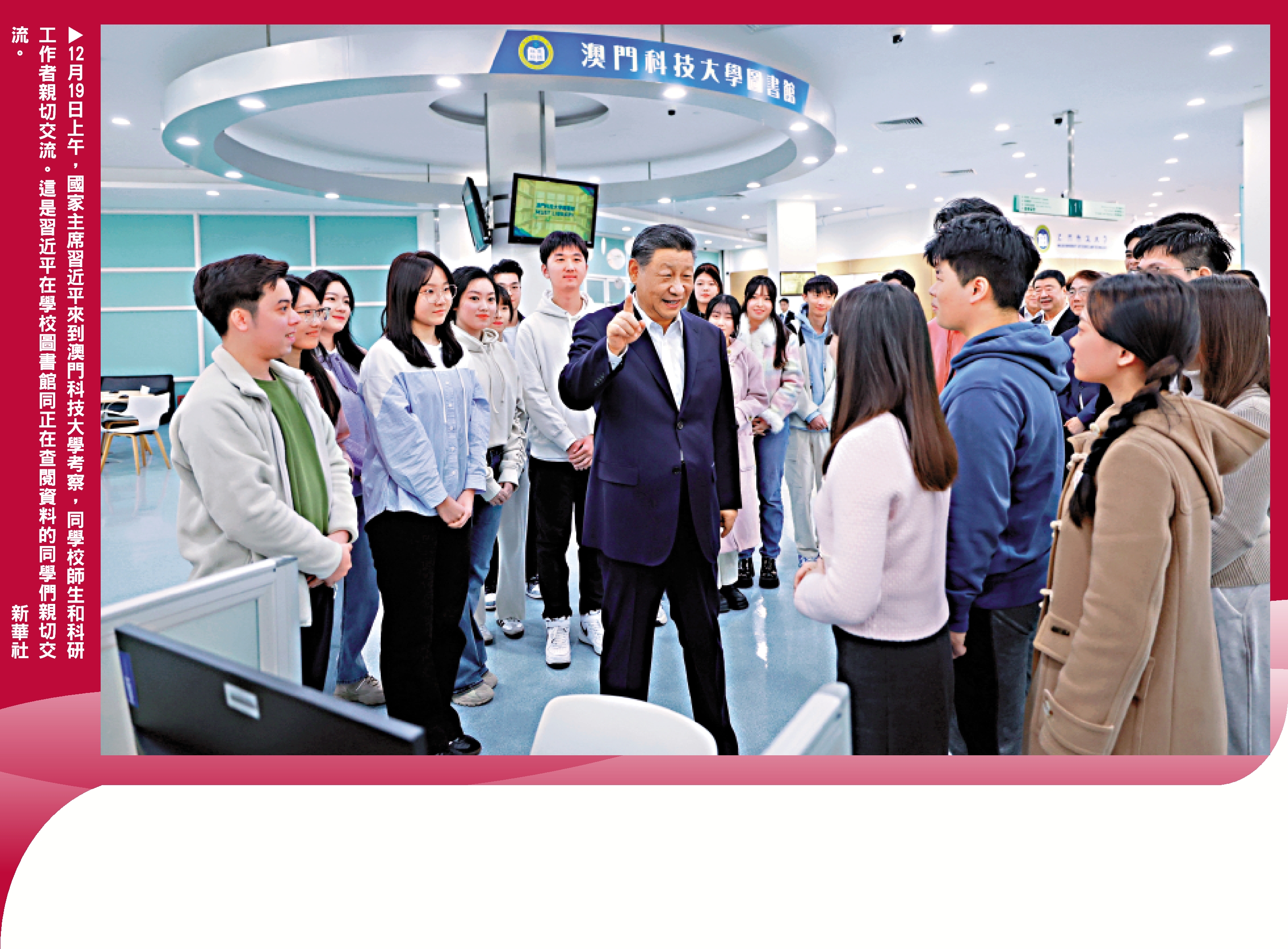 【大公報訊】19日上午,國家主席習近平在澳門特別行政區行政長官賀一誠陪同下,來到澳門科技大學視察,同學校師生和科研工作者親切交流。習近平對澳門堅持教育服務經濟社會發展,推進「教育興澳、人才建澳」的成績表示肯定。他表示,你們的工作證明,澳門是能夠做高精尖、國際一流科學研究的。