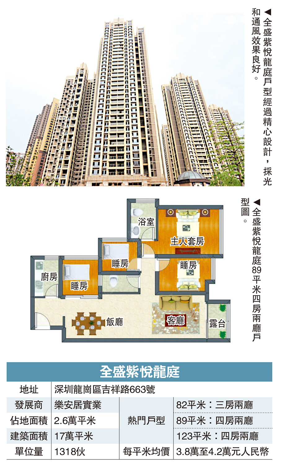 全盛紫悅龍庭位於龍崗區吉祥路,佔地2.6萬平米,建築面積17萬平米,有3幢高樓,每一幢樓有多個戶型,共計1318伙。間隔由小單位的一房至兩房,到大單位的三房至四房,每款戶型都經過精心設計,空間布局合理,採光和通風效果良好。主力戶型包括82平米三房和89平米四房。小區綠化率30%,共有953個停車位,略顯不足,市場每平米均價3.8萬至4.2萬元人民幣。