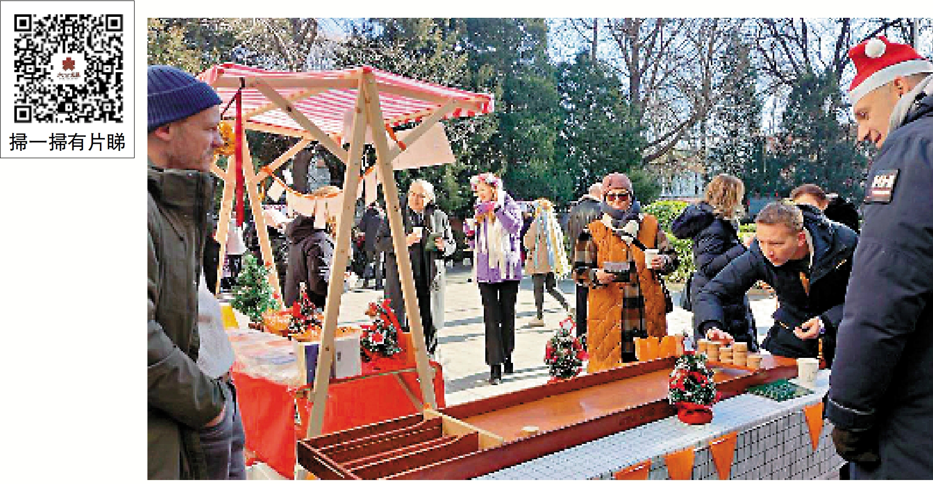 與此同時,烏克蘭駐華大使館與愛沙尼亞、芬蘭、德國、愛爾蘭、拉脫維亞、摩爾多瓦、荷蘭、北馬奇頓、羅馬尼亞、斯洛伐克大使館共同舉辦了聖誕市集。在這個市集上,各國文化交相輝映,從薑餅糖果到熱紅酒,從趣味小遊戲到傳統表演,每一個角落都充滿了探索與驚喜。荷蘭攤位的Sjoelen遊戲、愛沙尼亞的煮鹹蠶豆配酒、愛爾蘭的熱威士忌……這些特色,也成了在北京過聖誕的獨有體驗。